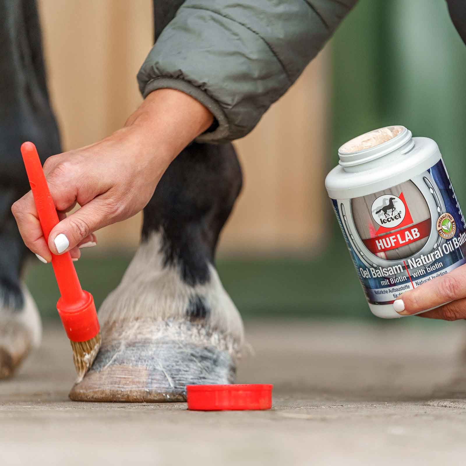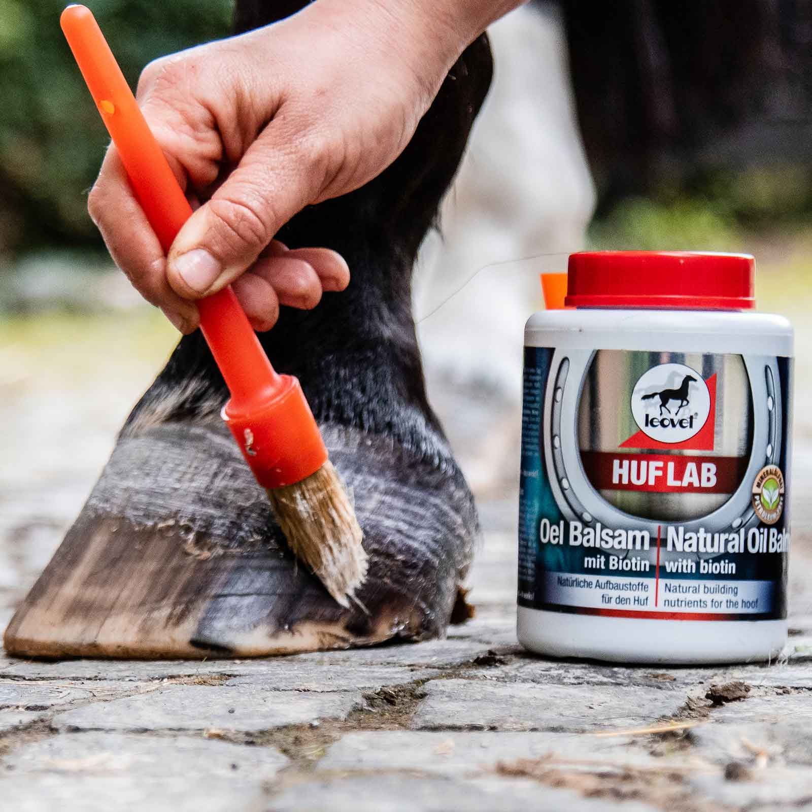 Der neue, natürliche Hufbalsam von Leovet mit Pinsel für jeden Tag. Der cremiger Hufbalsam mit natürlich pflegenden Ölen sorgt für feste und elastische Hufe. Das enthaltene Biotin zählt zu den wasserlöslichen B-Vitaminen ist bekannt für seine Schutzfunktion von Haut & Haaren. Es wirkt es sich positiv auf das Hornwachstum aus und der Huf wird deutlich gestärkt. Mit dem HUFLAB Oel Balsam, wird Feuchtigkeit tief in das Horn transportiert. Der HUFLAB Oel Balsam zieht schnell bis in die Kapillaren ein und verbessert entscheidend die Hornqualität. Für schön glänzende Hufe! Enthält keine Vaseline, Mineralöle und Parabene!