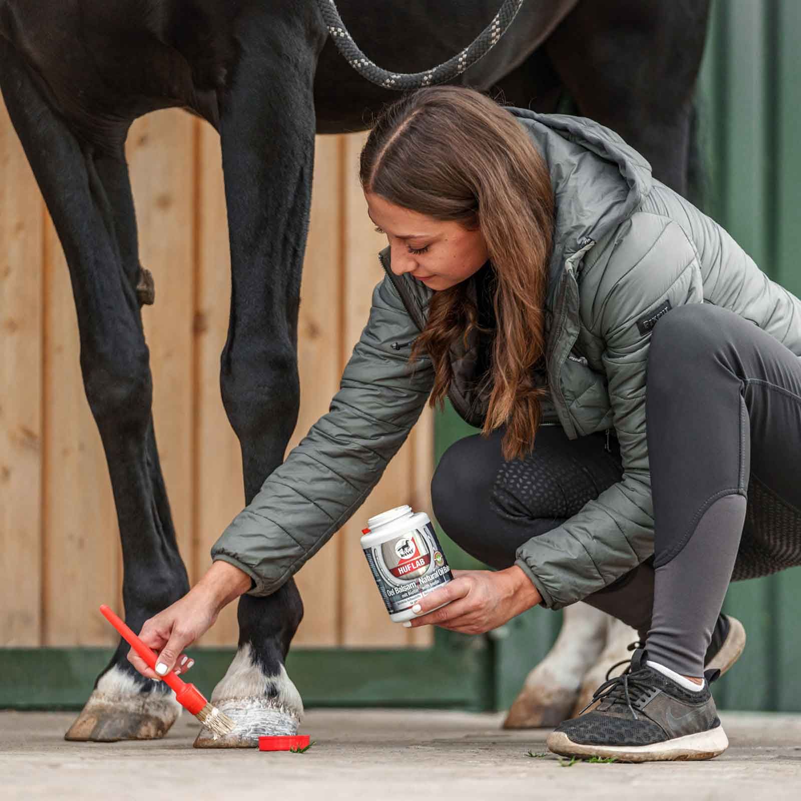 Der mitgelieferte Pinsel macht das Auftragen des Hufbalsams leicht.