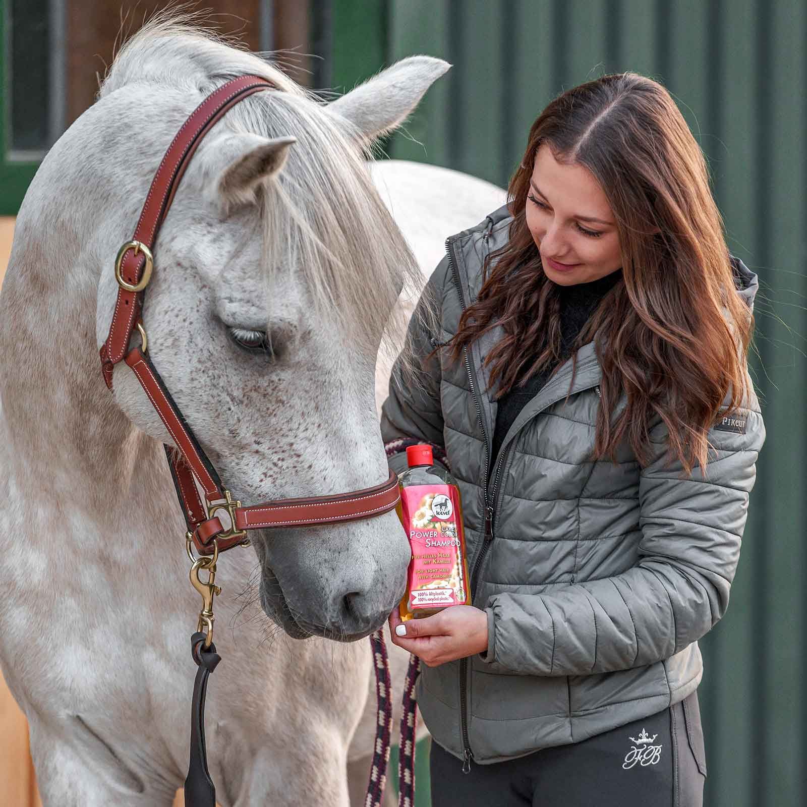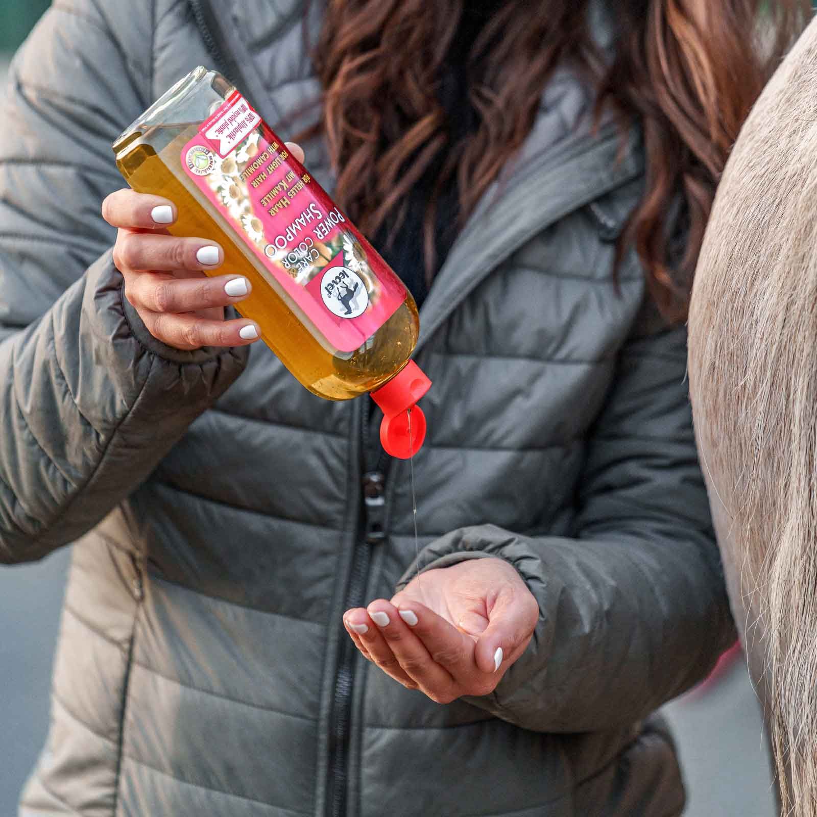 Power Pferde-Shampoo mit römischer Kamille die natürlich aufhellt und hellem Fell & Haar glänzende Farbreflexe verleiht.