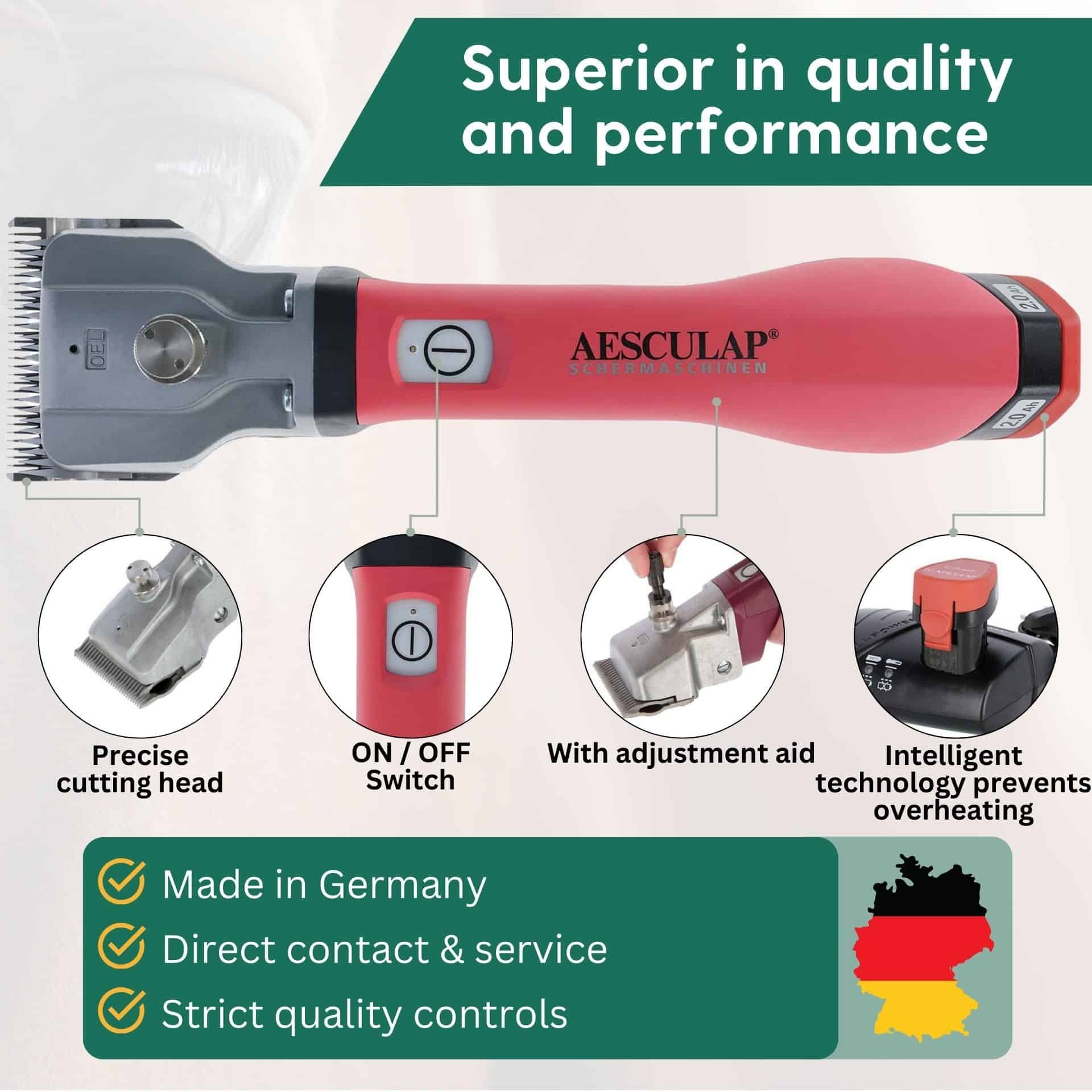 Erlebe die Perfektion in der Fellpflege mit Aesculap Schermaschinen – dein Partner für professionelle Fellpflege seit 1912. Aesculap steht für herausragende deutsche Qualität und bietet ein breites Produktprogramm für jede Anforderung. Kabellose Schermaschinen und Trimmer ermöglichen maximale Flexibilität für Detailschur, während Hybridmaschinen die Wahl zwischen Netz- und Akkubetrieb bieten. Die Maschinen sind kraftvoll, laufruhig und ideal für den täglichen Einsatz. Perfekt für Heim- und Nutztiere, bieten sie zuverlässige und stressfreie Schur mit stabiler Leistung und geringer Geräuschentwicklung. Original Aesculap Scherköpfe garantieren anerkannte Qualität für professionelle Ergebnisse. Wähle Aesculap und vertraue auf über 100 Jahre Präzision und Langlebigkeit.
