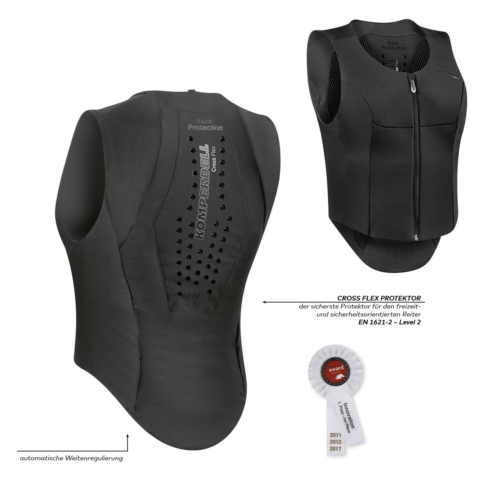 Die Sicherheitsweste stellt sich dank der automatischen Weitenregulierung beim Schließen des Front-Reißverschlusses automatisch auf den Umfang des Reiters ein, wobei sich die integrierten Dual-Density Schäume beim Tragen angenehm an die Wirbelsäule anschmiegen.