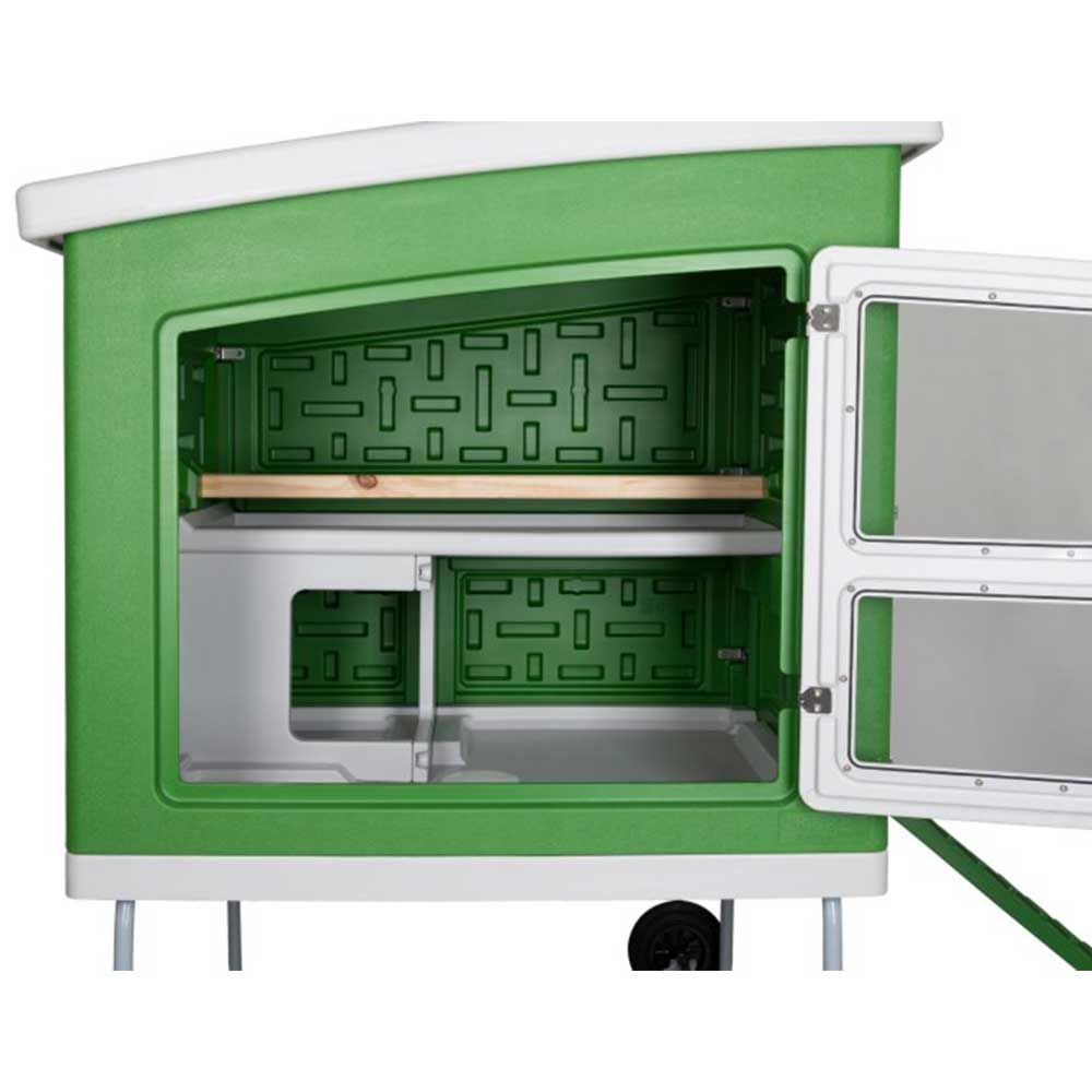 Das Hühnerhaus Mobile Coop enthält eine Hühnerleiter und eine Sitzstange, auf dem Ihre gefiederten Freunde gerne sitzen. Die Kotwanne unter der Sitzstange sorgt dafür, dass Sie nicht jeden Tag die Einstreu in diesem Bereich austauschen müssen. Das Kotbrett kann zum Reinigen leicht und schnell über eine Seitenöffnung herausgezogen werden. In dem abgedunkelten Legenest mit abgerundeter Sitzstange können die Hühner in Ruhe brüten. Die extra Öffnung des Legenests von außen ermöglicht eine schnelle Eiabnahme.