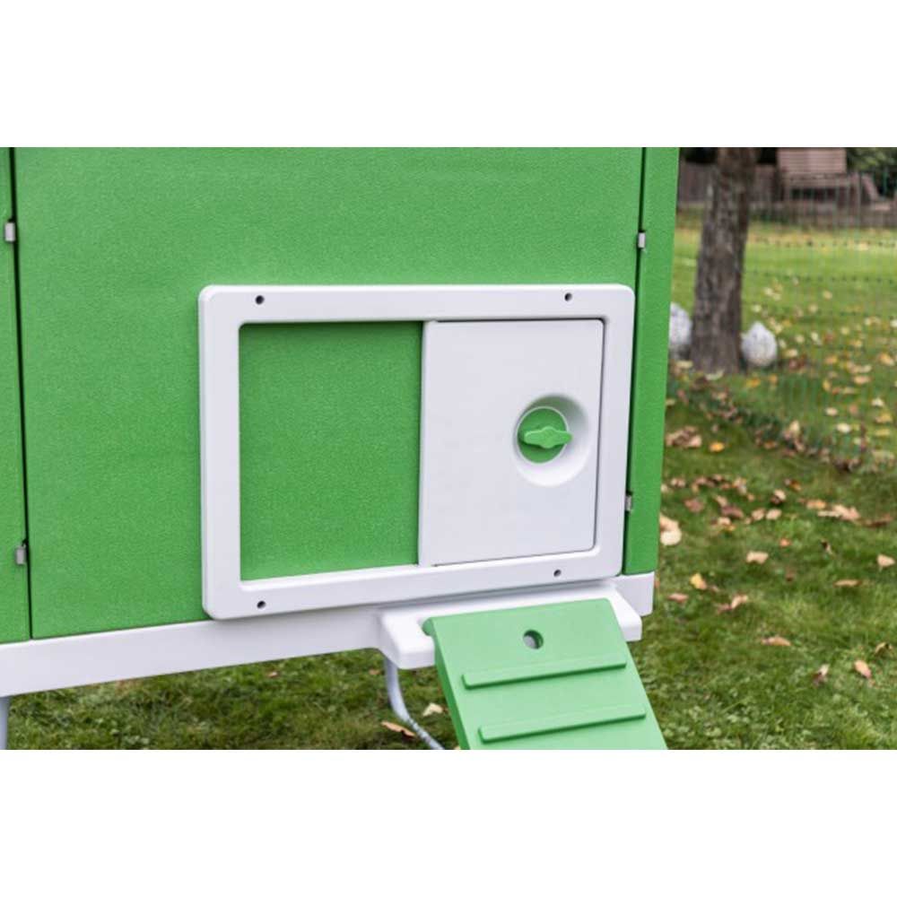 Die Tür mit großem Fenster sorgt für Helligkeit im Stall und garantiert einen gesunden Tag-Nacht-Rhythmus. Eine sichere Türverriegelung schützt vor unerwünschten Gästen (z.B. Marder, Fuchs, Waschbär). Glatte Oberflächen erschweren der roten Vogelmilbe das Einnisten. Die Innenraumreinigung ist denkbar leicht mit Besen oder Gartenschlauch erledigt. Der Kot läuft über eine Öffnung am Innenboden ab. Der mobile Hühnerstall ist durch fest montierte Gewindeeinsätze schnell und einfach am gewünschten Ort aufgestellt.