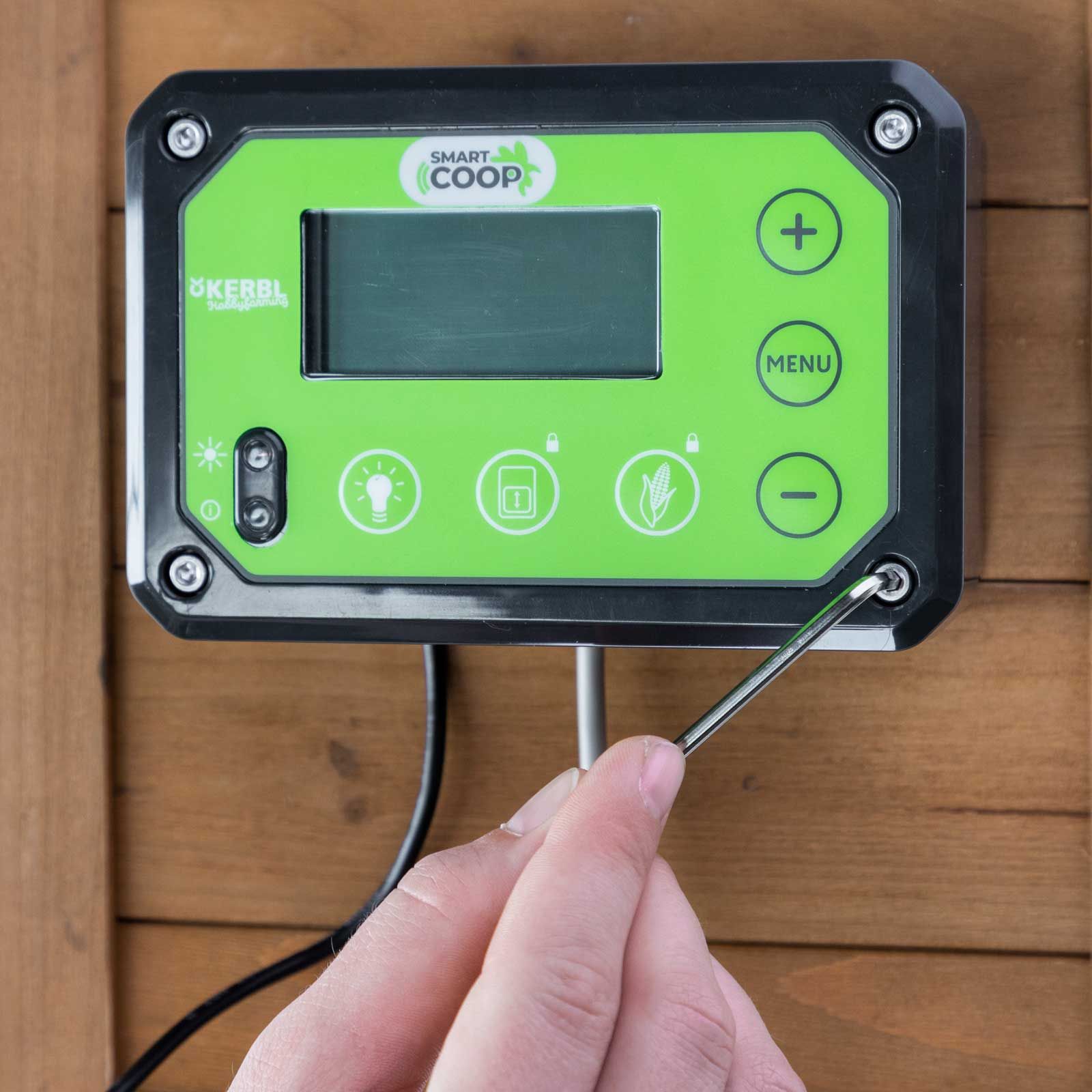 Die SmartCoop Steuerung verfügt über einen integrierten Lichtsensor, dieser ermöglicht eine tageslichtabhängige Steuerung der verschiedenen SmartCoop Module. Die LED-Zustandsanzeige bietet einen schnellen Überblick über den aktuellen Status des Systems.