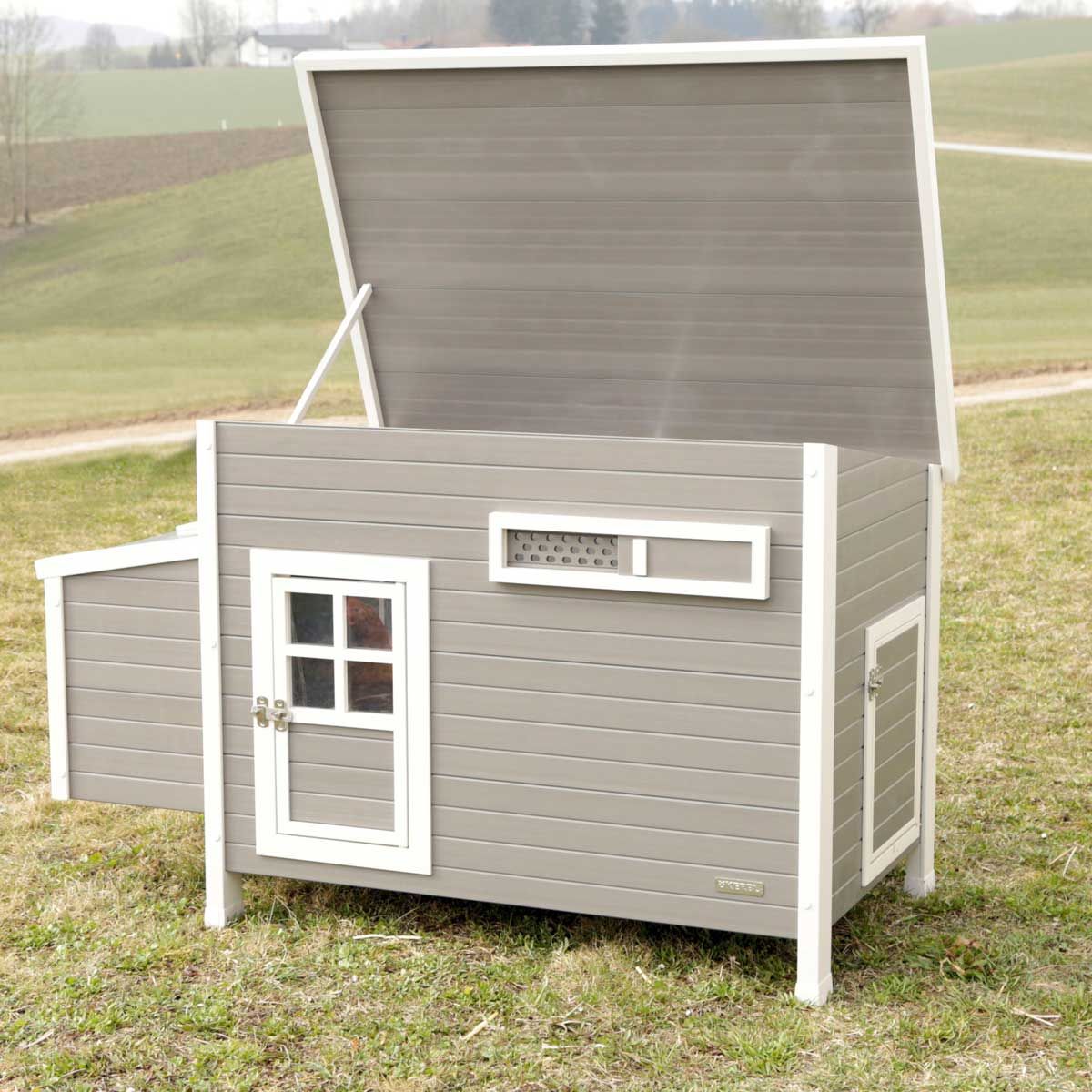 Das besondere am Hühnerstall Barney ist das wetterfeste und langlebige ECO-Kunststoff Material aus 60% Kunststoff und 40% Holz. Jetzt im Set mit passendem Freigehege.