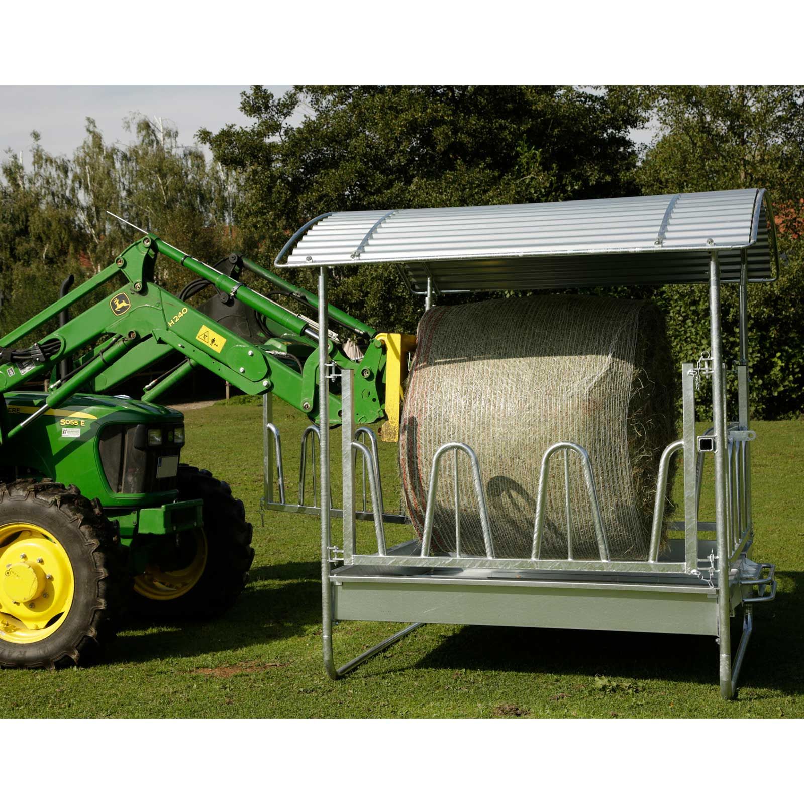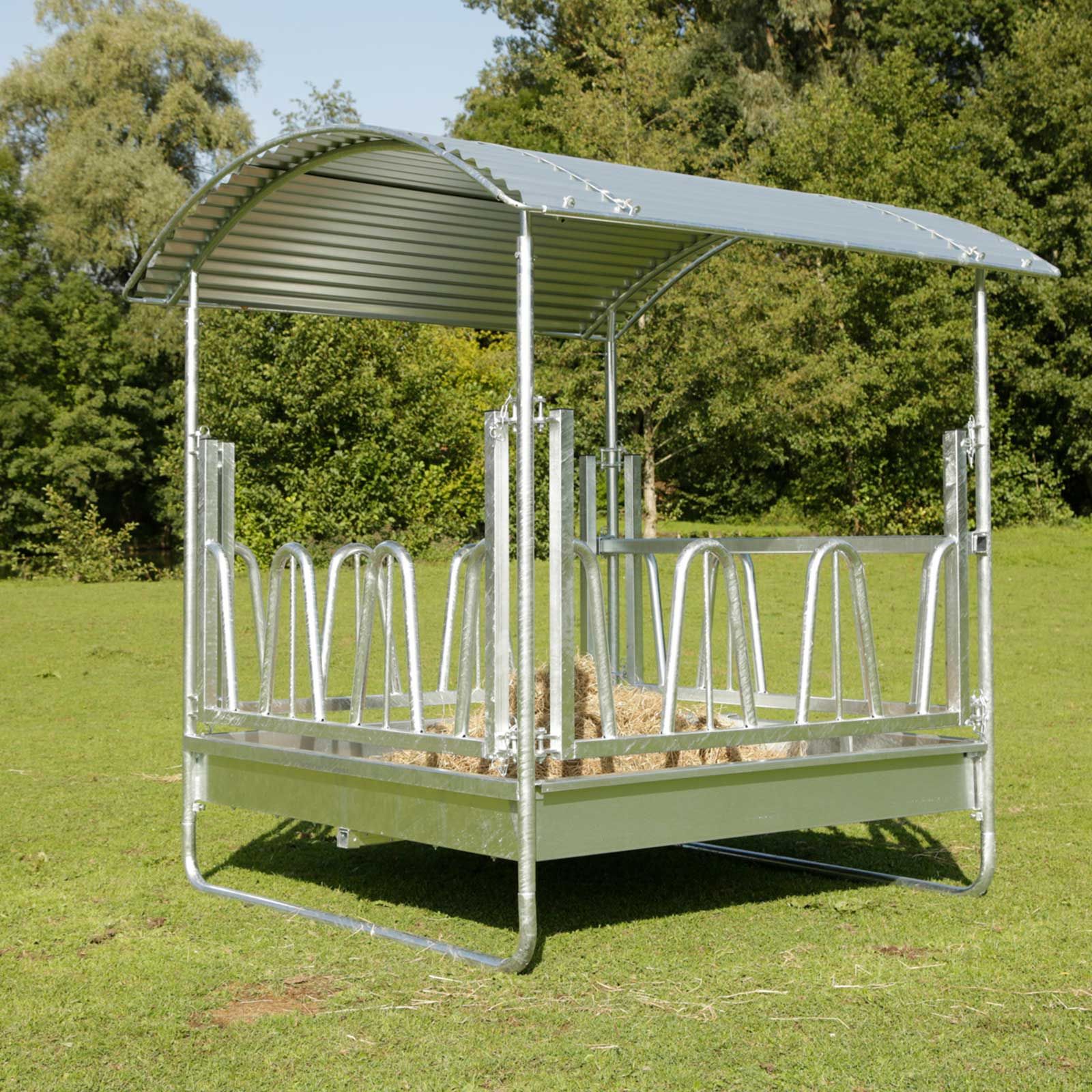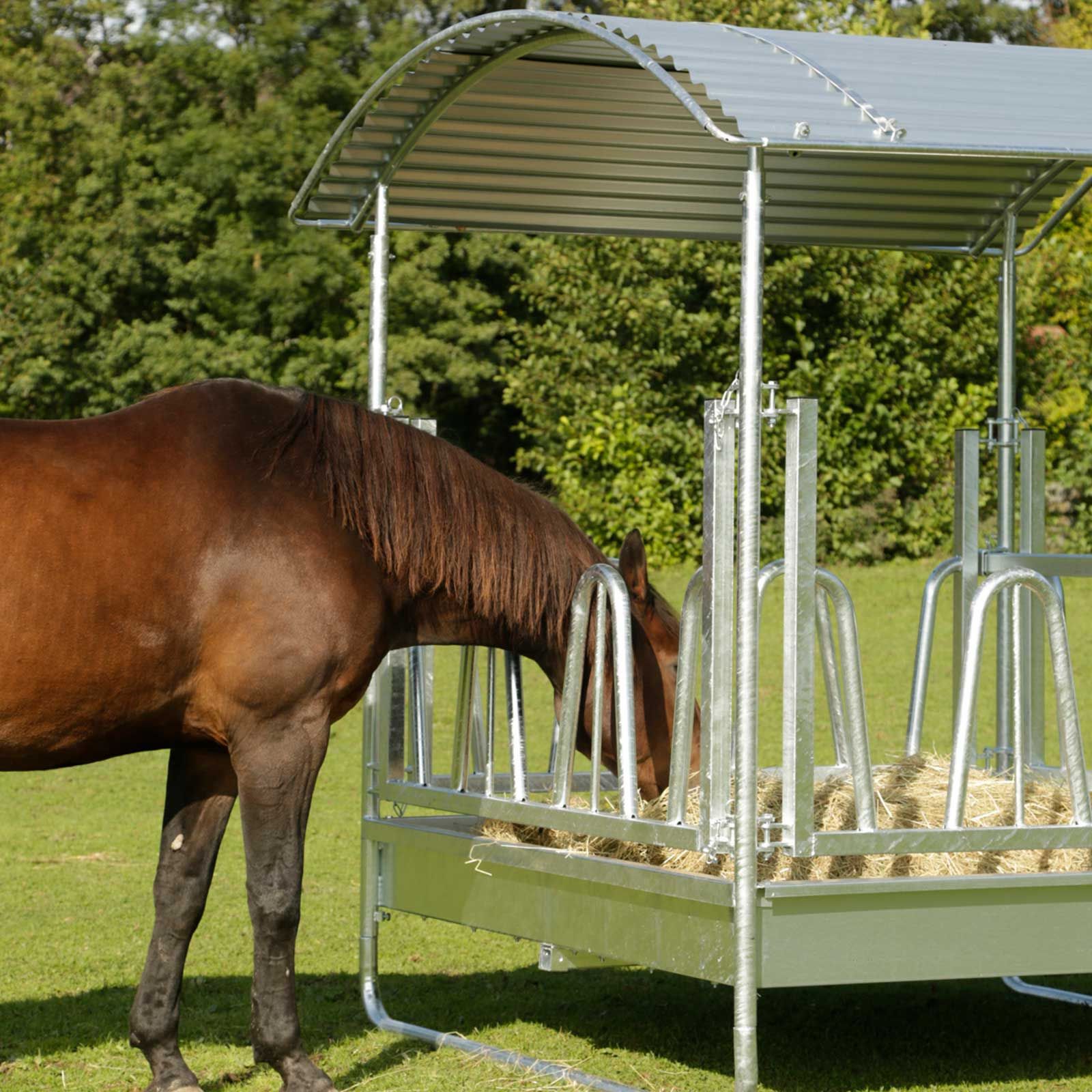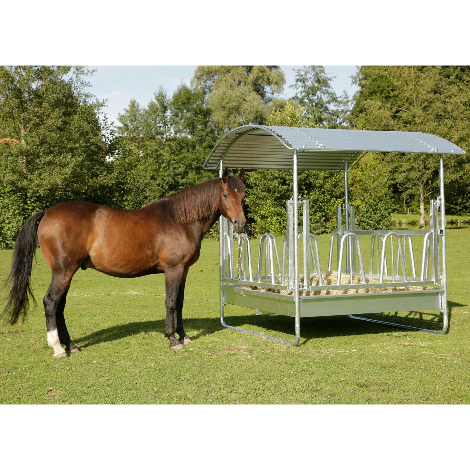 Die Futterraufe bietet 12 Fressplätze für Pferde und Rinder und ist für Rechteck- und Rundballen bis 1,8 m Länge bzw. Durchmesser geeignet. Die Heuraufe ist zusätzlich mit einem Vierkantrohr-Unterzug ausgestattet und feuerverzinkt. Da 2 Seiten geöffnet werden können, kann die Futterraufe unkompliziert mit Rechteck- und Rundballen befüllt werden. Durch dass Dach ist das Futter in der Raufe nicht total nass, so wird eine gute Futterqualität über eine längere Zeit gewährleistet. Der Futterverlust ist durch die Auffangwanne gering und kann mit einem Futterspanetz noch optimiert werden.