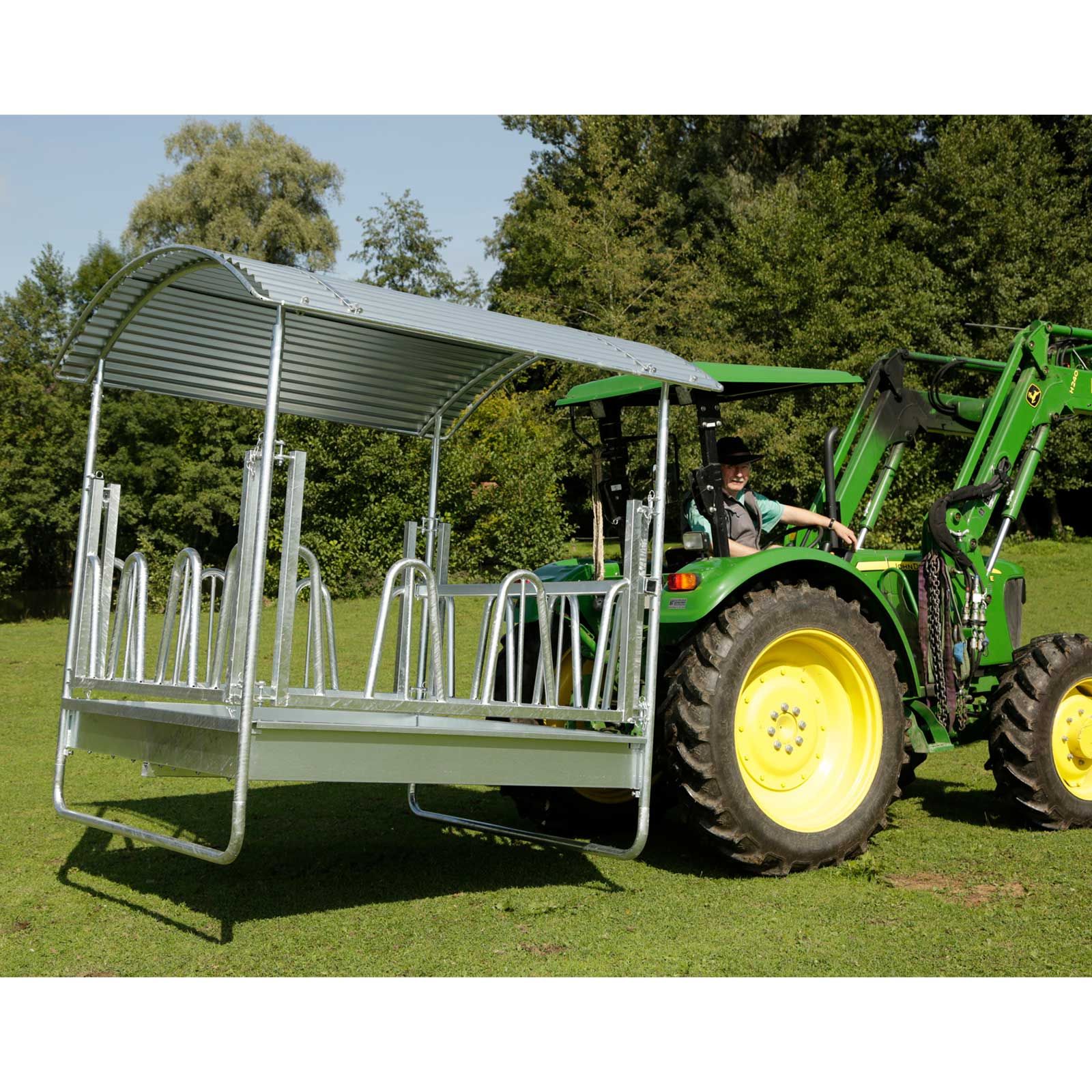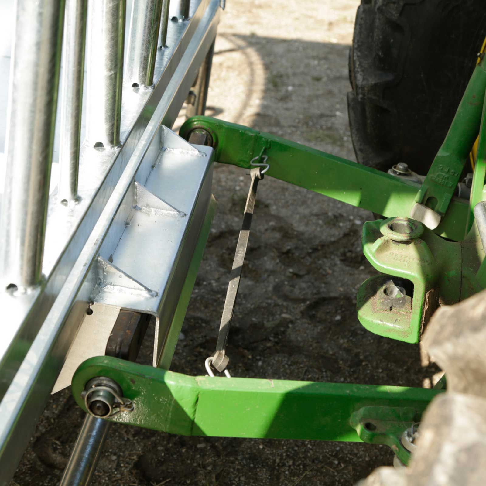 Der Stellplatz der Heuraufe für Pfere und Rinder kann durch die stabile Dreipunktanhängung einfach mit dem Traktor verändert werden. Der mitgelieferte Schutzbügel und der umlaufende Dachkantenschutz schützen die Tiere vor Verletzungen.