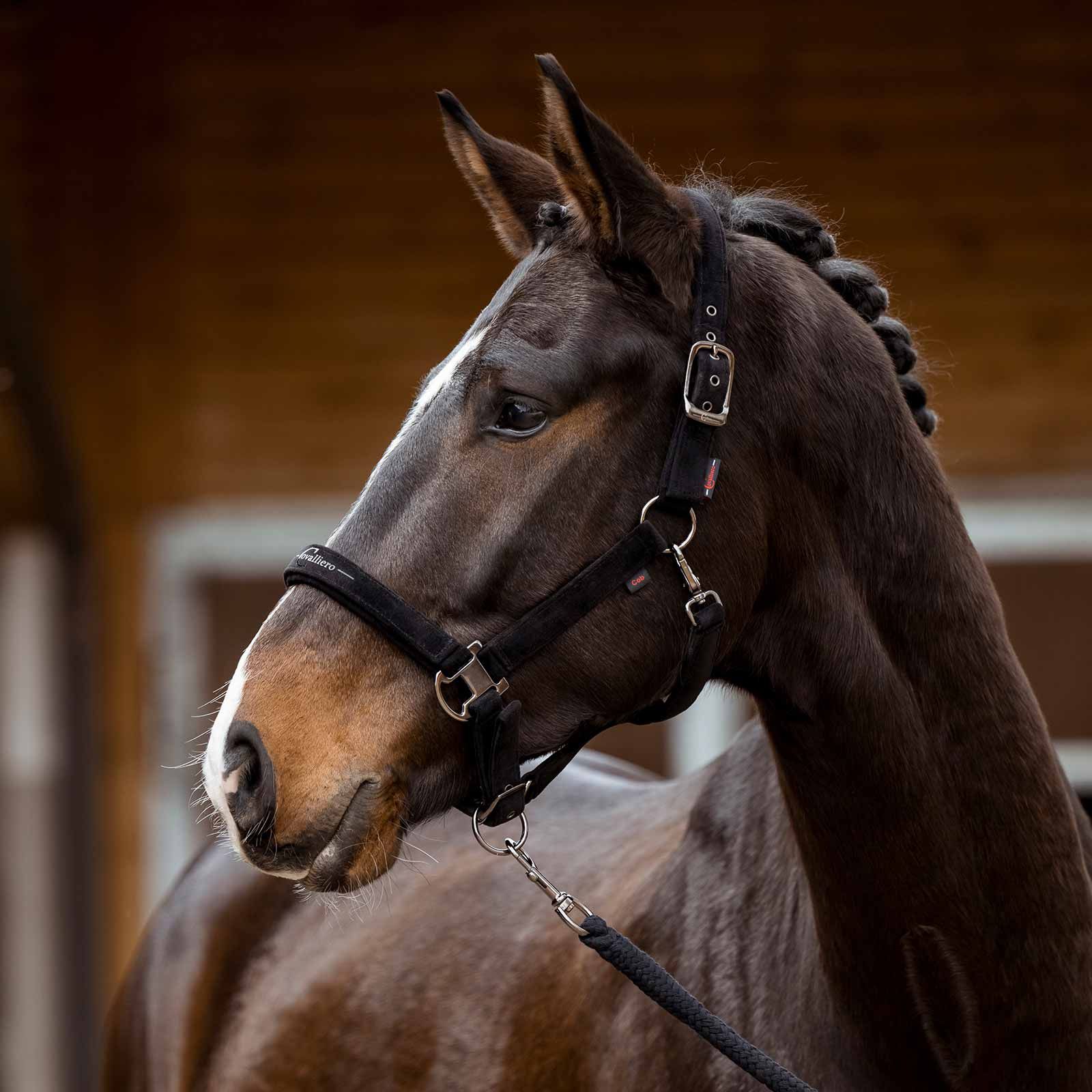 Das Halfter besteht aus stabilem Gurtmaterial, das mit luxuriösem Samt ummantelt ist. Dies verleiht dem Halfter eine angenehme Haptik und sorgt für maximalen Tragekomfort für Ihr Pferd. Die massiven Metallic-Optik-Beschläge verleihen zusätzlich einen Hauch von Luxus.
