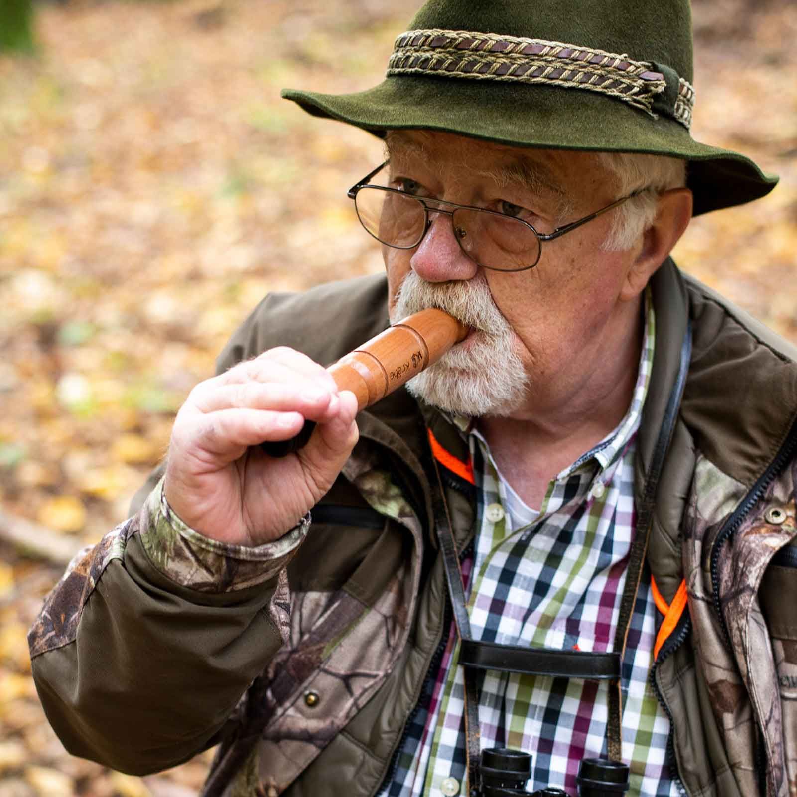 Dieser Lockruf basiert auf dem bekannten Weisskirchen Wildschweinlockruf. Die internen Teile wurden vereinfacht und ein kurzes Gummischlauchstück wurde als Dämpfer hinzugefügt, um den Klang zu modulieren. Entfernen Sie dieses Schlauchstück, wird der Klang höher, sodass Sie eine Vielzahl von Klängen mit nur einem Instrument erzeugen können.
