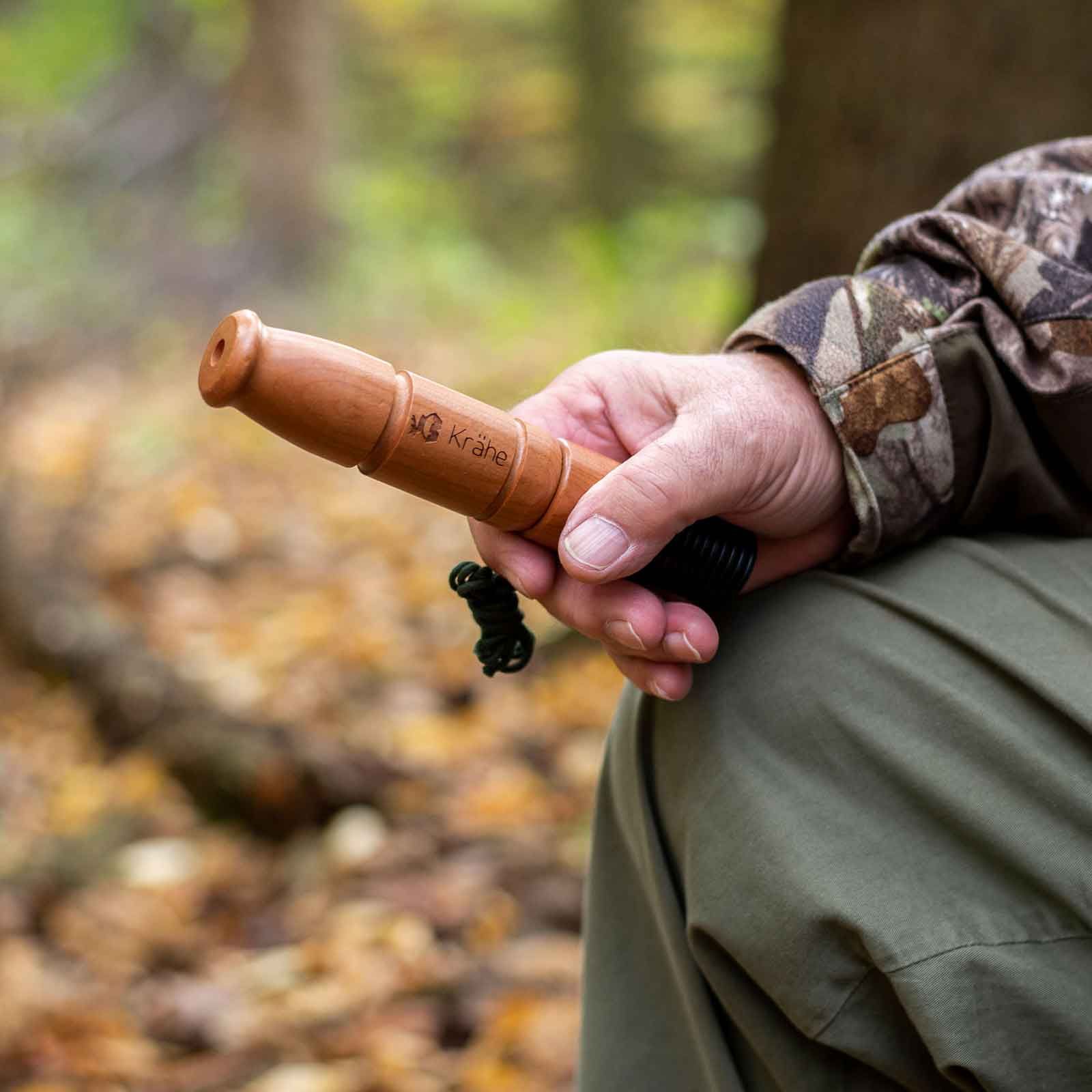 Halten Sie den Lockruf einfach in die Handfläche, pusten Sie leicht hinein und öffnen und schließen Sie abwechselnd Ihre Hand, um den typischen Warnruf von Raben und Krähen nachzuahmen.