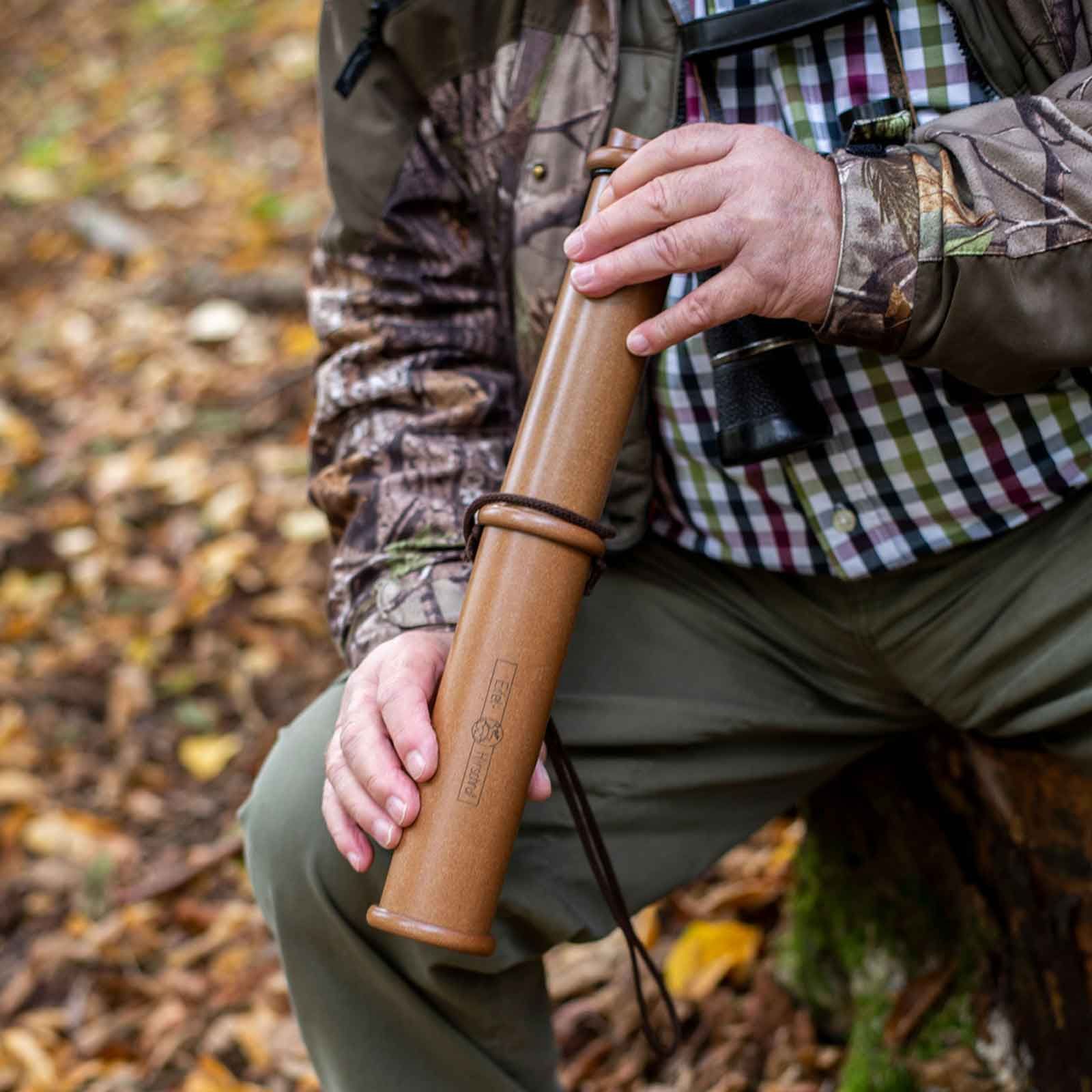 Der Weisskirchen Eifelhirschruf ist vielseitig und kann eine Vielzahl von Hirschklängen nachahmen; er ist auch nützlich, um Wildschweine anzulocken. Sein teleskopisches Design mit zwei Segmenten, die von 24 bis 40 cm reichen, ermöglicht es Ihnen, einen tieferen Klang zu erzeugen und sich an verschiedene Jagdsituationen anzupassen. Dank seiner Kompaktheit kann er bei Nichtgebrauch leicht verstaut werden.