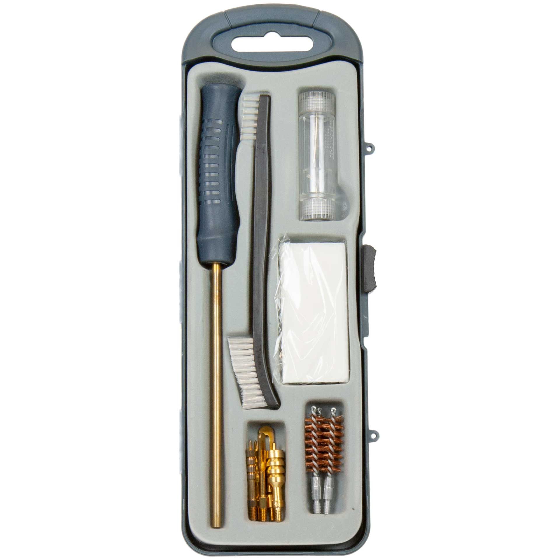 Im Set enthalten ist ein einteiliger Reinigungsstab aus Messing, drei phosphorbronze Bürsten (.22, .38, .45), drei Messingbürstenköpfe (.22, .38, .45), zwei Schlitzköpfe aus Messing, eine Nylonbürste und eine Packung Reinigungstücher. Darüber hinaus enthält das Set eine Flasche mit zwei getrennten Kammern für Schmiermittel und Reinigungsmittel.