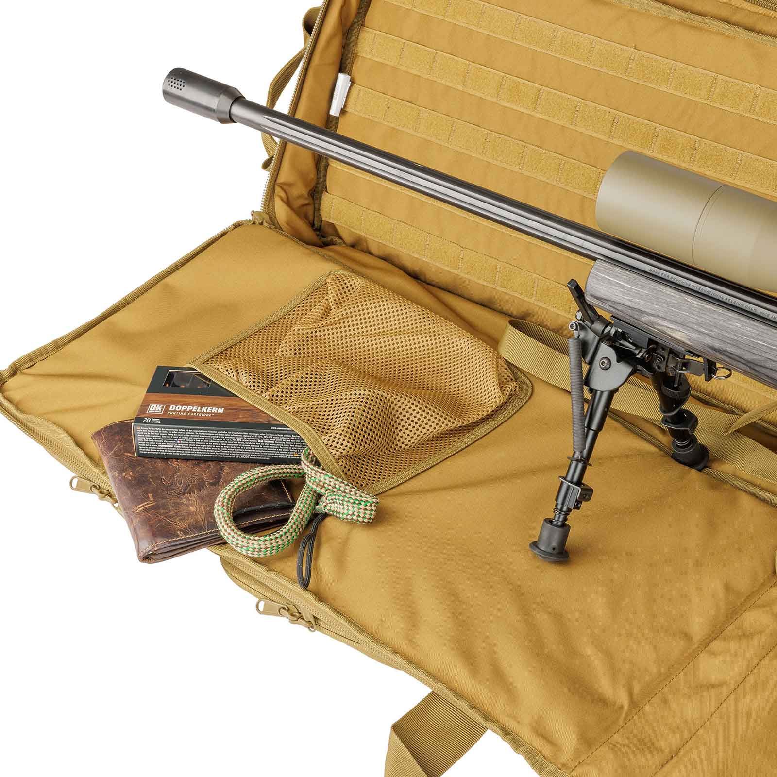 Die Waffentasche ist aus 1000D Nylon gefertigt, einem Material, das für seine Haltbarkeit und Widerstandsfähigkeit bekannt ist. YKK-Reißverschlüsse sorgen für eine sichere Aufbewahrung Ihrer Waffe und einfache Zugänglichkeit. Sie kann Waffen mit einer maximalen Länge von etwa 130 cm aufnehmen.