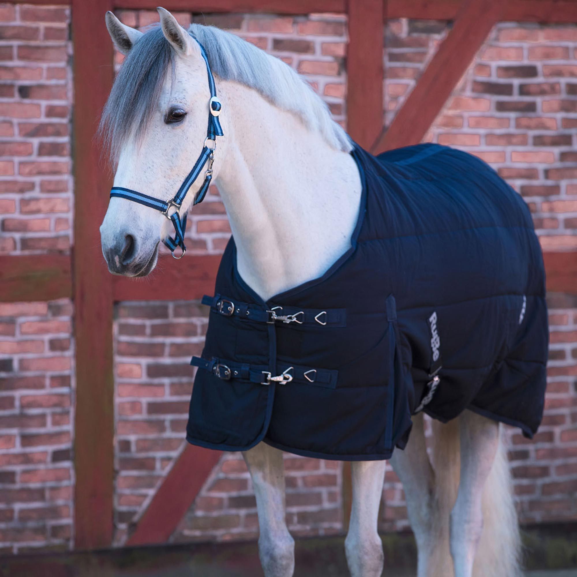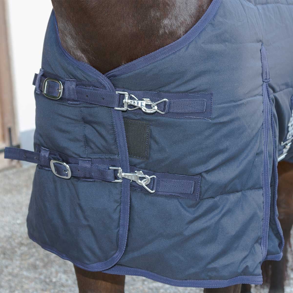 Die Unterziehdecke oder auch Stalldecke ist mit einem breitem Schweiflatz und verstellbaren Beinschnüren ausgestattet. Eine doppelte Brustverschnallung mit Dornschnallen, Karabiner und D-Ringen sorgen für einen guten Halt. Die warme Stalldecke ist mit 150g gefüttert und wärmt Ihr Pferd bei kalten Temperaturen. Die weiche Pferdedecke ist mit einem angenehmen Baumwoll Innenfutter gefüttert welches nicht am Fell scheuert.