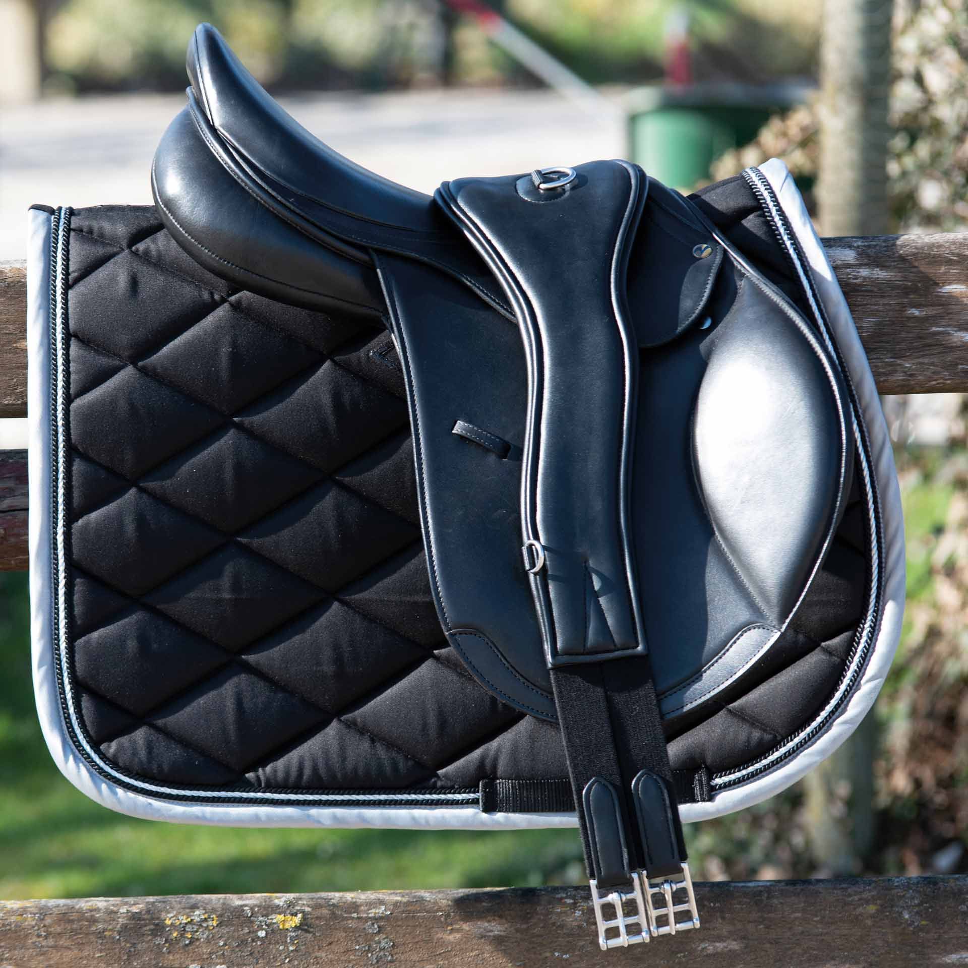 Die weiche, gepolsterte Einlage sorgt nicht nur für hohen Komfort, sondern auch für eine gute Stabilität und eine angenehm ruhige Gurtlage. Mit einem großen D-Ring in der Mitte und kleinen D-Ringen an den Seiten bietet der Sattelgurt verschiedene Optionen zum schnellen Einschnallen von Hilfszügeln. Hinzu kommen die beidseitig elastischen Gurte mit extra starkem Dreifach-Gummi, die eine sichere und passgenaue Befestigung des Sattels ermöglichen.