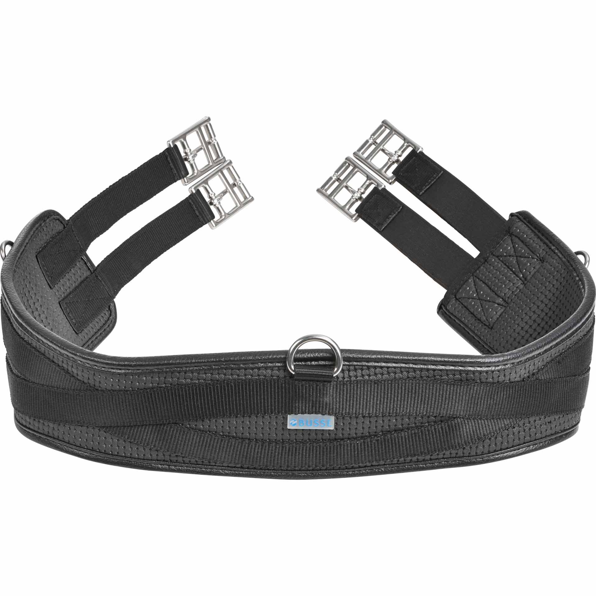 Der BUSSE Sattelgurt VINYL-GEL-LONG D, elastisch ist mit einem großen D-Ring in der Mitte und kleinen D-Ringen an der Seite für das schnelle Einschnallen von Hilfszügeln ausgestattet. Außerdem ist der Gurt einseitig elastisch. Die Expert-Schnallen, Dornschnallen aus Edelstahl mit extrem langlebigen Rollen ohne Schweißnaht, schonen die Sattelgurtstrupfen und ermöglichen durch eine Einkerbung ein besonders flaches Gurten.