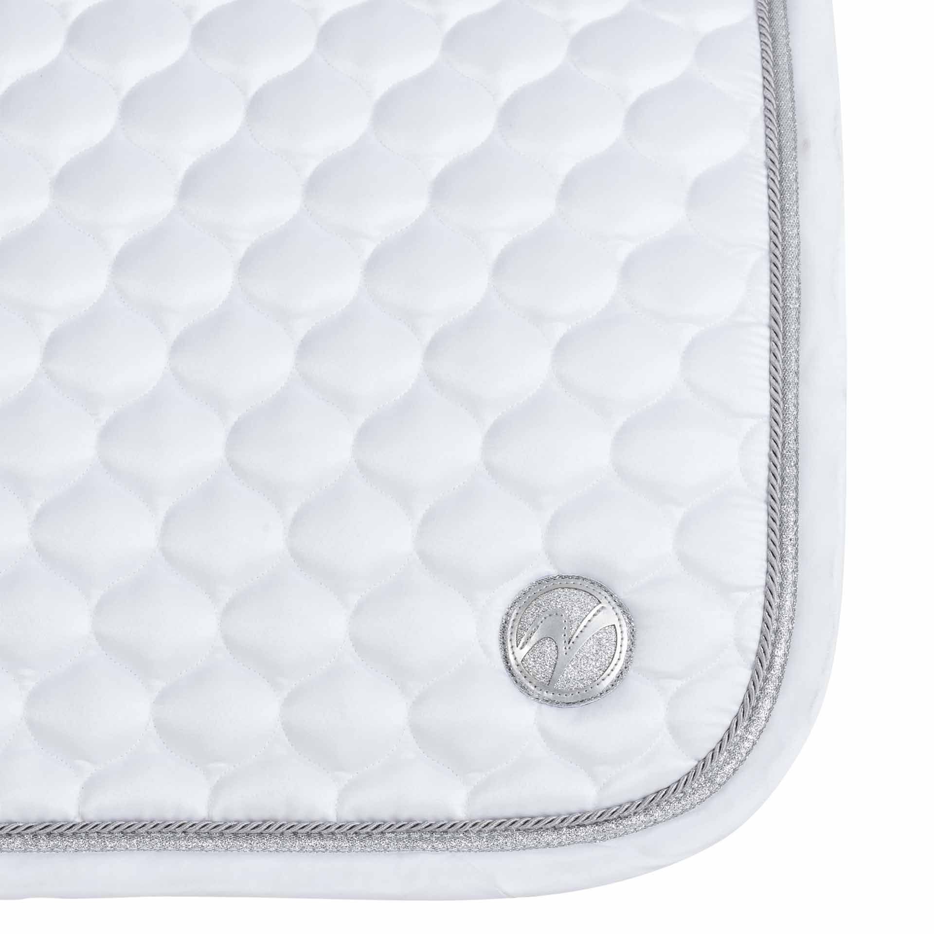 Silikonapplikationen verhindern effektiv das Verrutschen der Schabracke unter dem Sattel. Das Obermaterial und der Einfass bestehen aus Polyestersatin, was dem Design einen glänzenden Abschluss gibt. Das Erscheinungsbild wird durch eine glänzende Kordel und eine glitzernde Bordüre weiter verbessert. Eine formstabile, gut polsternde Einlage aus Schaumstoff und Polyestervlies sorgt für zusätzlichen Komfort.