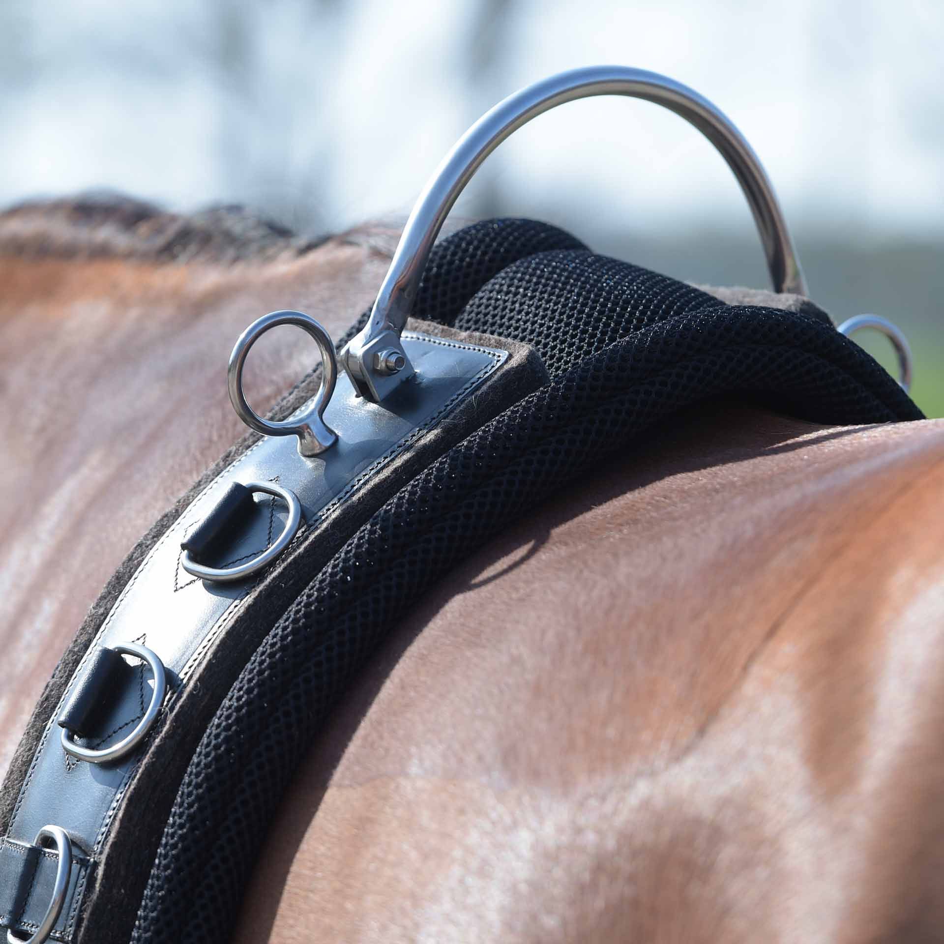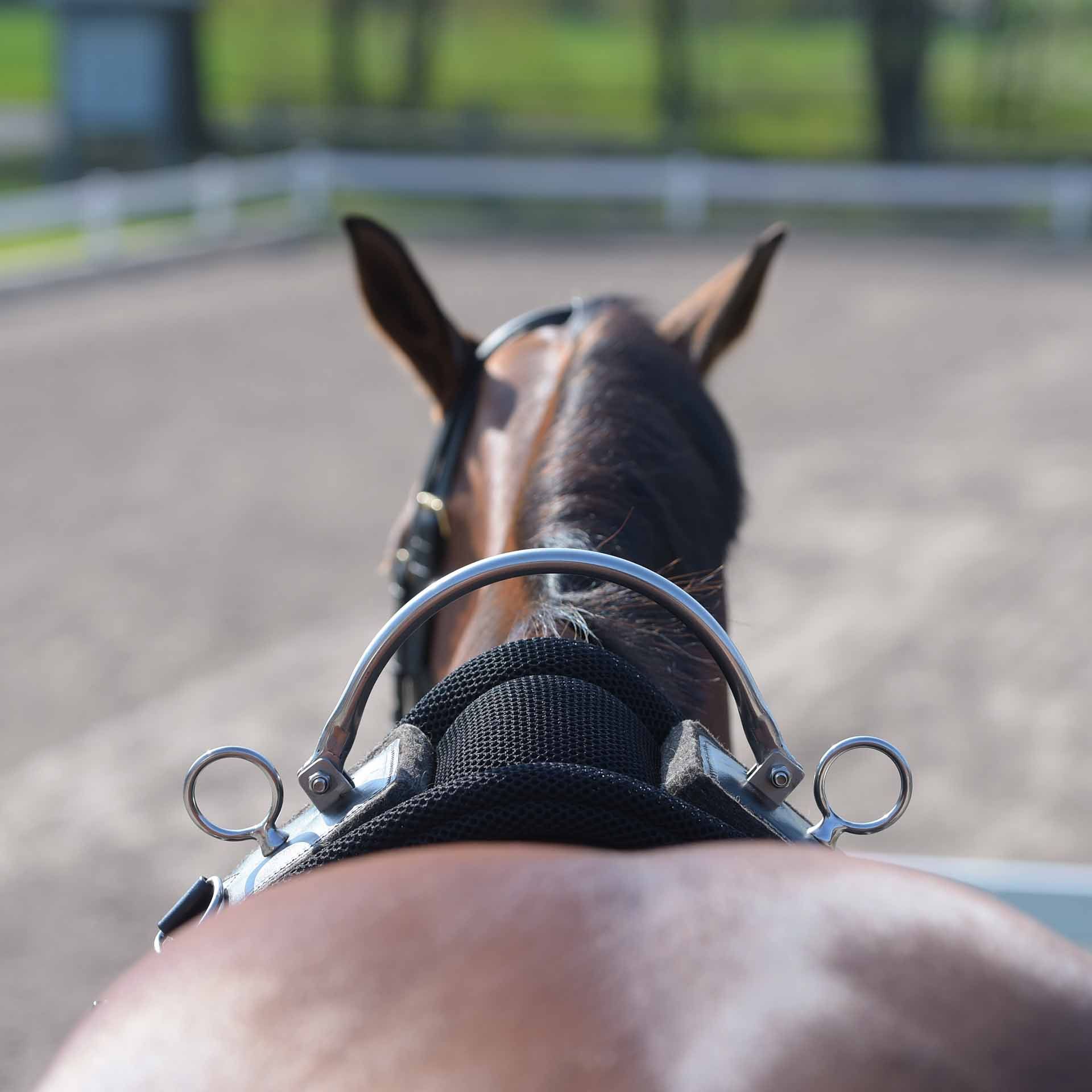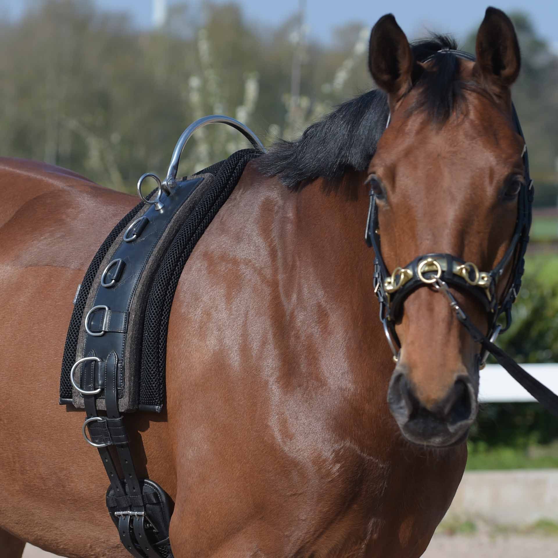 - mit Schabracke und allen herkömmlichen Longiergurtunterlagen verwendbar, kann ebenfalls über einen Sattel gegurtet werden