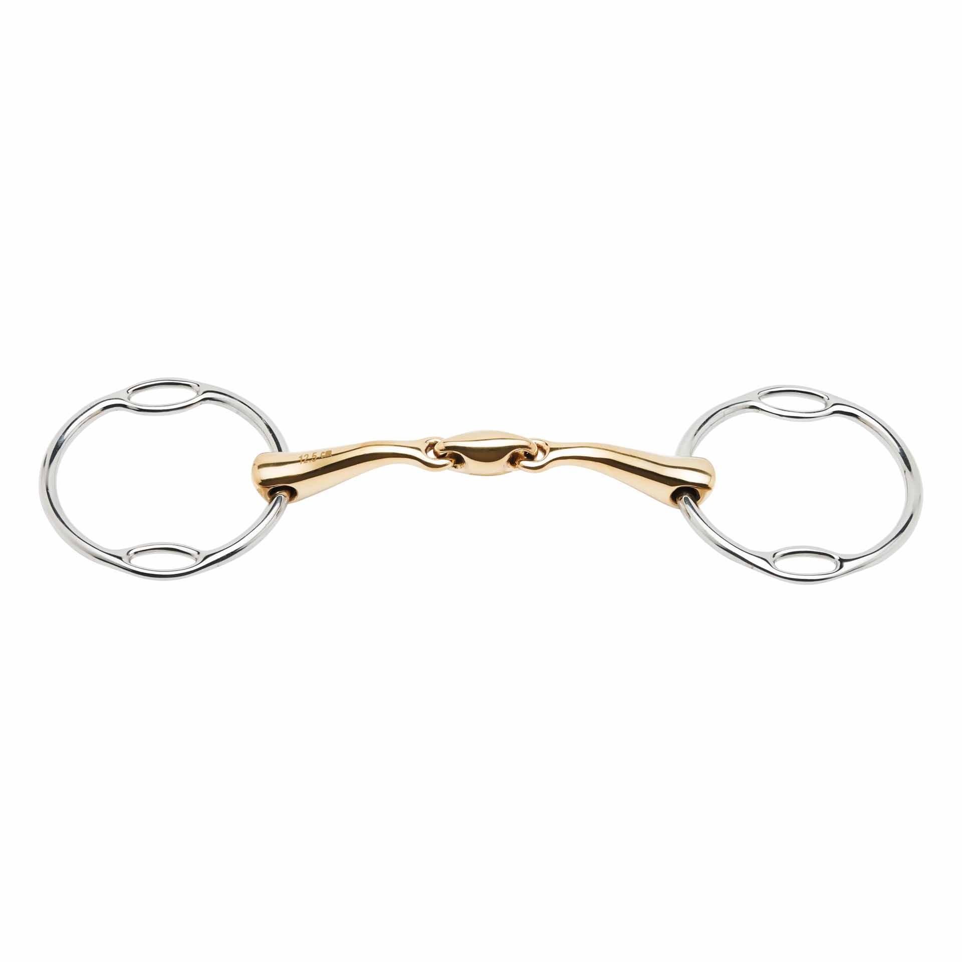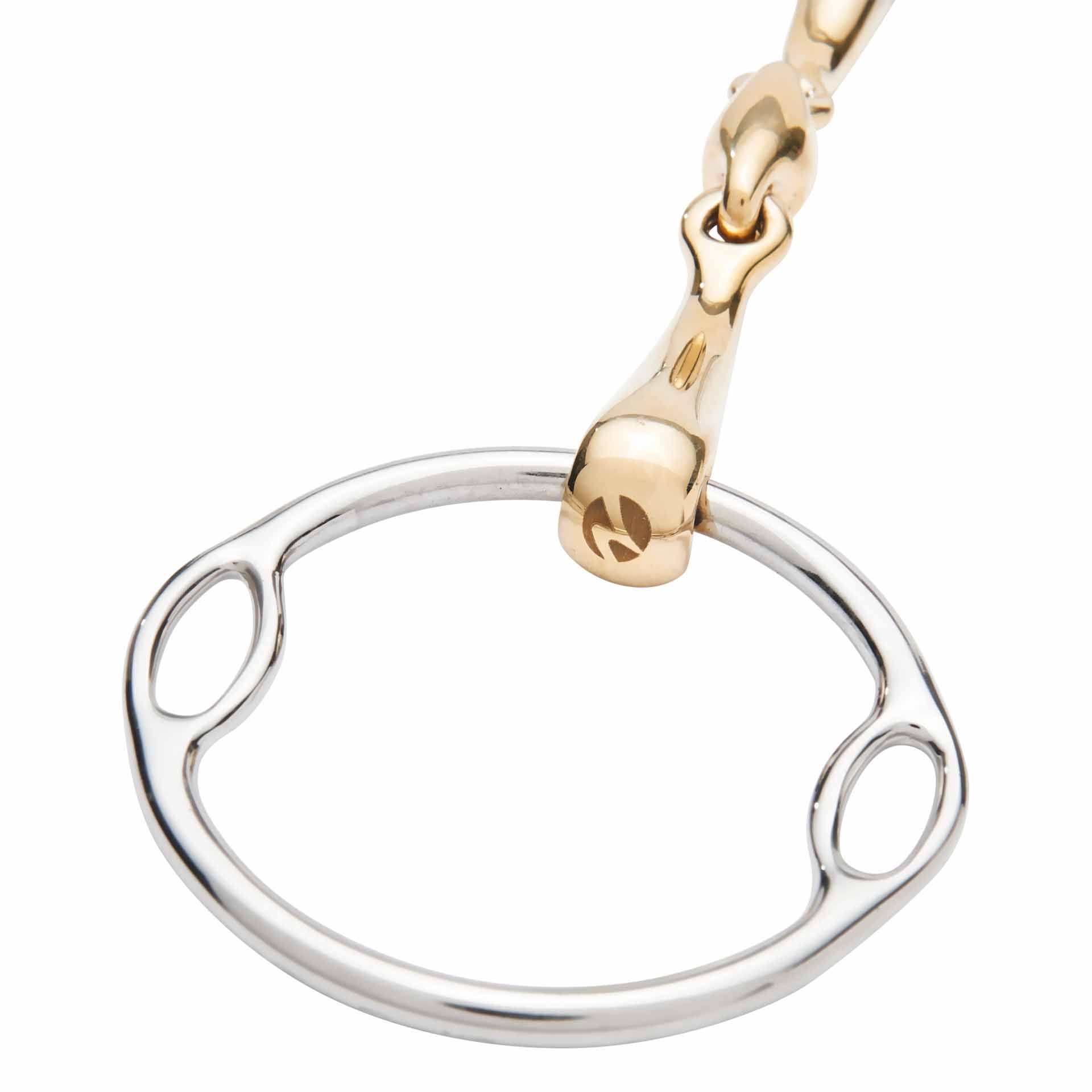 Das Mundstück des Gebisses besteht aus dem hochwertigen Material Kaugan®, das eine verbesserte Akzeptanz und Einspeichelung beim Pferd fördert und so den Tragekomfort erheblich steigert. Zudem sind sämtliche Verbindungsglieder perfekt auf die jeweilige Gebissgröße und -stärke abgestimmt, was eine optimale Passform und Stabilität sicherstellt. Die Ringe aus robustem Edelstahl garantieren Langlebigkeit und Beständigkeit.