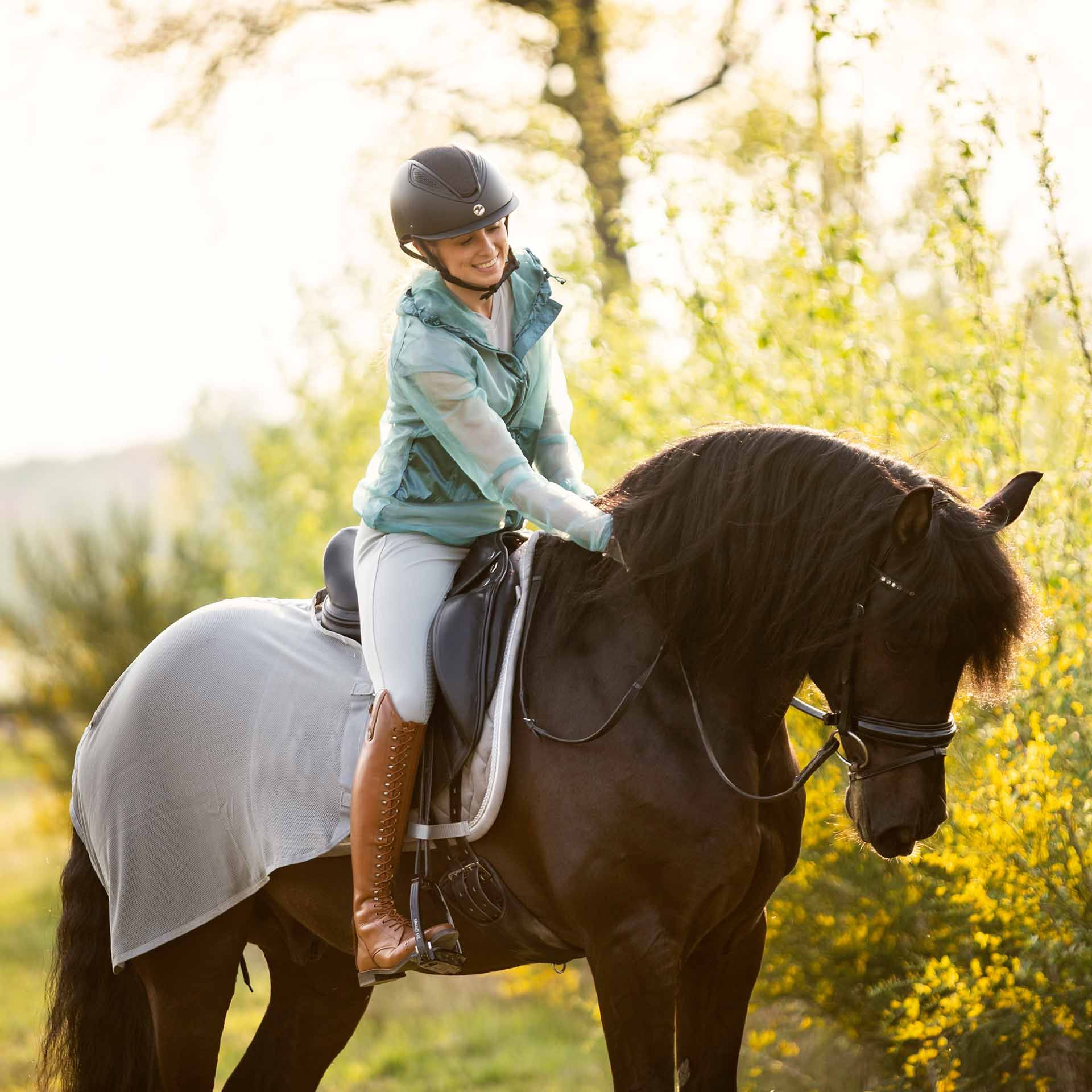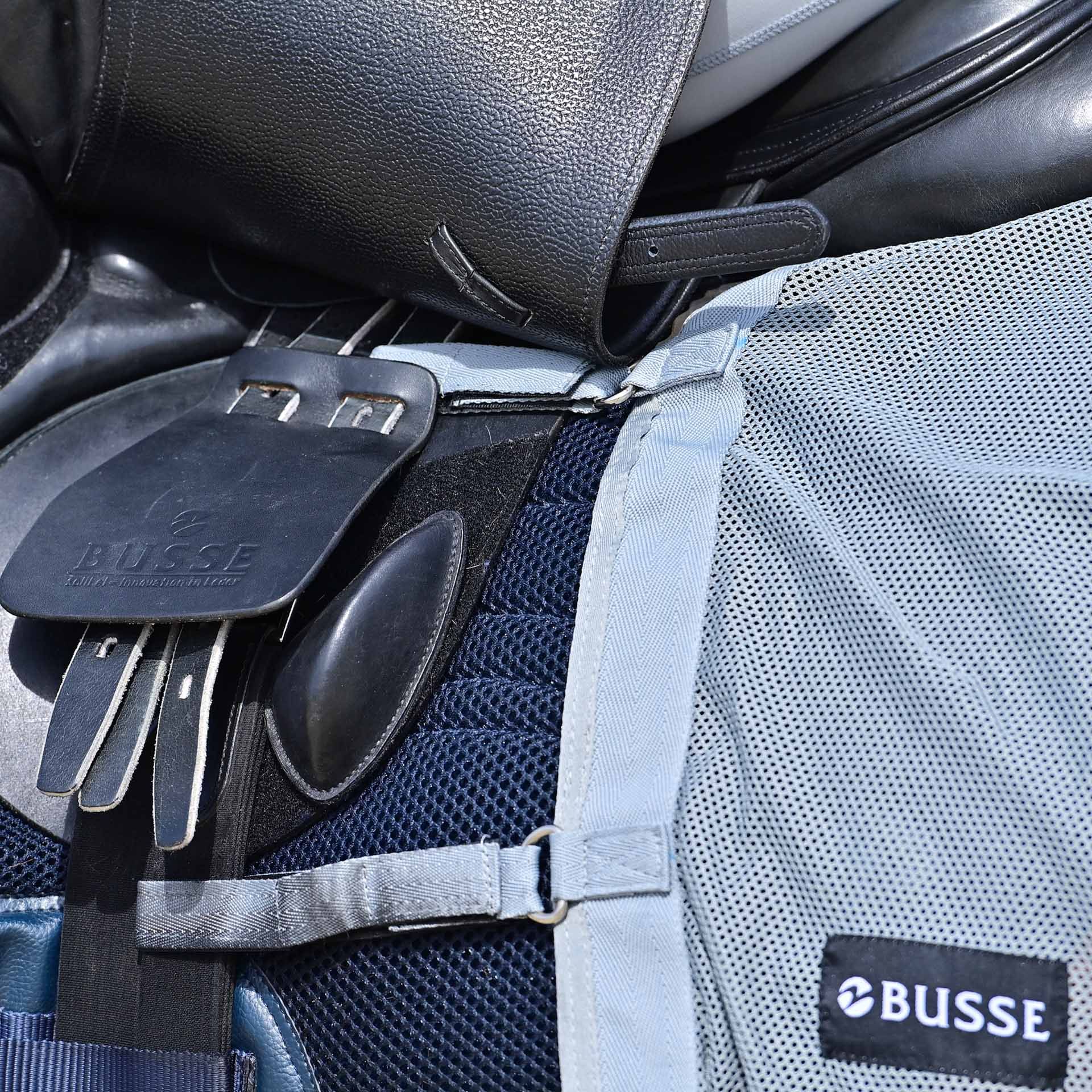 Die BUSSE Trainingsdecke FLY ist besonders geeignet für Reiter und Pferde, die während des Trainings häufig von Insekten gestört werden. Sie bietet Schutz und Komfort und kann in höheren Gangarten oder beim Springen sicher fixiert werden.