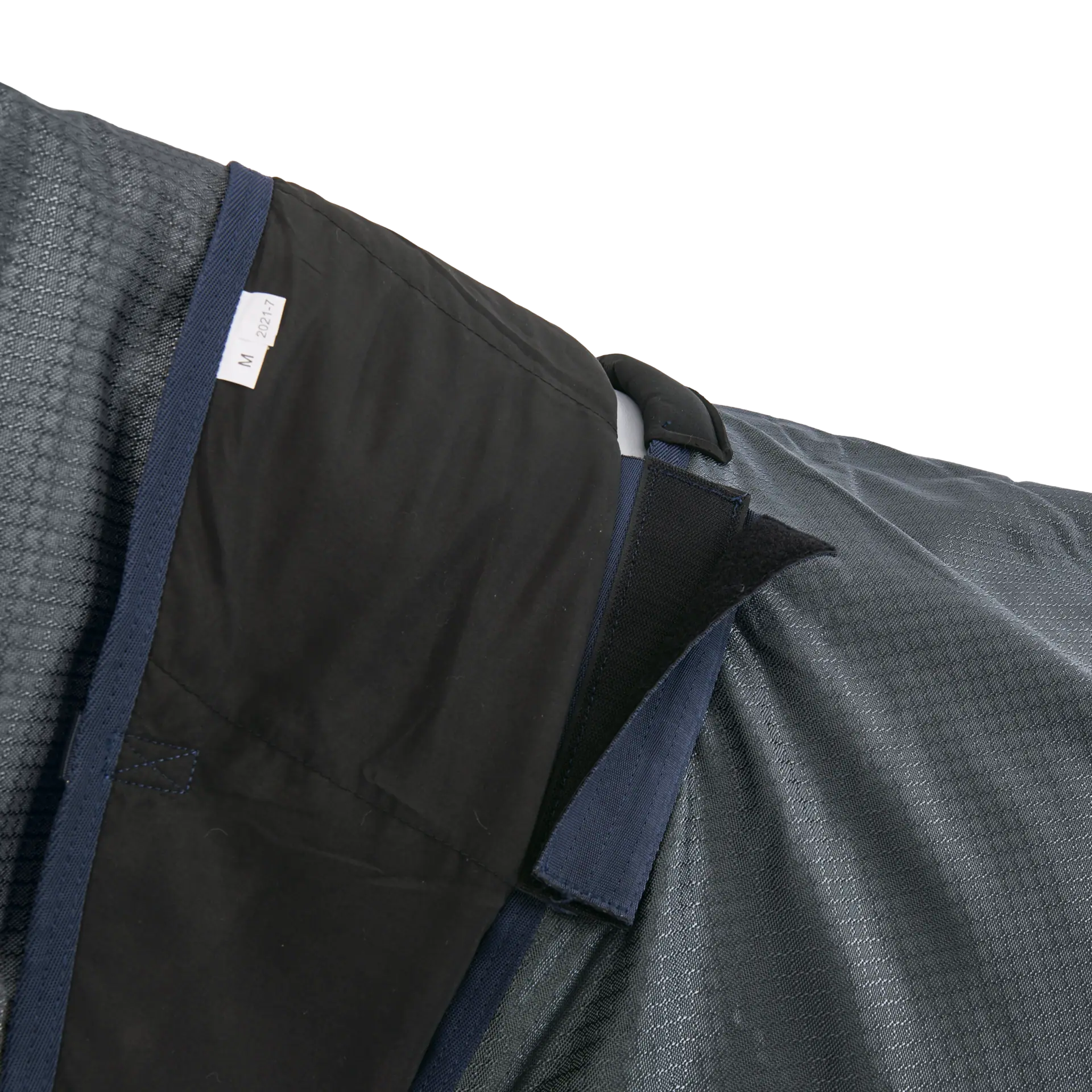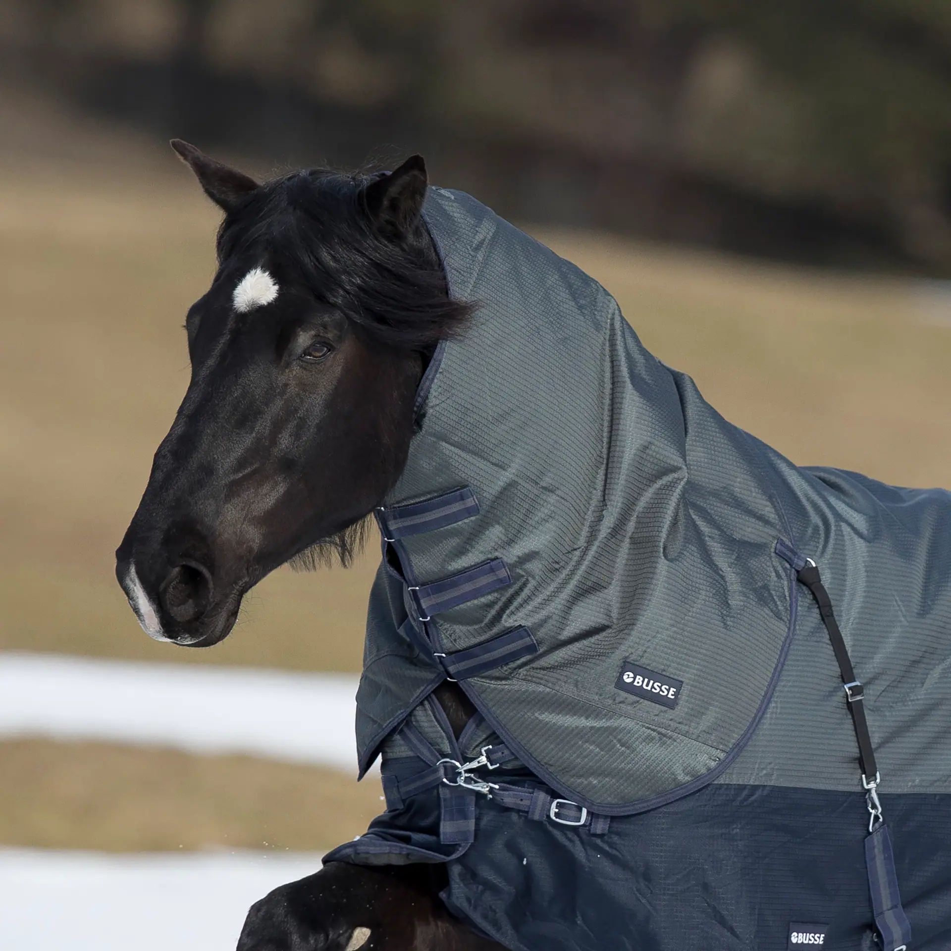 Aus äußerst strapazierfähigem, extra reißfestem und funktionserprobtem 840 den Nylon Double Ripstop gefertigt, gewährleistet das Halsteil Langlebigkeit und Schutz. Im Inneren sorgt das DRYsense-Lining, ein besonders fellfreundliches und schnelltrocknendes Polyestergewebe, für eine soft-trockene Haptik auch bei wetterbedingter hoher Luftfeuchtigkeit. So wird Kondensfeuchtigkeit vermieden und das Halsteil wird von innen nicht klamm, auch wenn es zwischendurch vom Pferd heruntergenommen wird. Mit einer leichten Wärmeisolierung von 75 g Polyfill, ist das Halsteil zudem atmungsaktiv (3000 g/m²/24h) und wasserdicht (5000 mm), sowie winddicht.