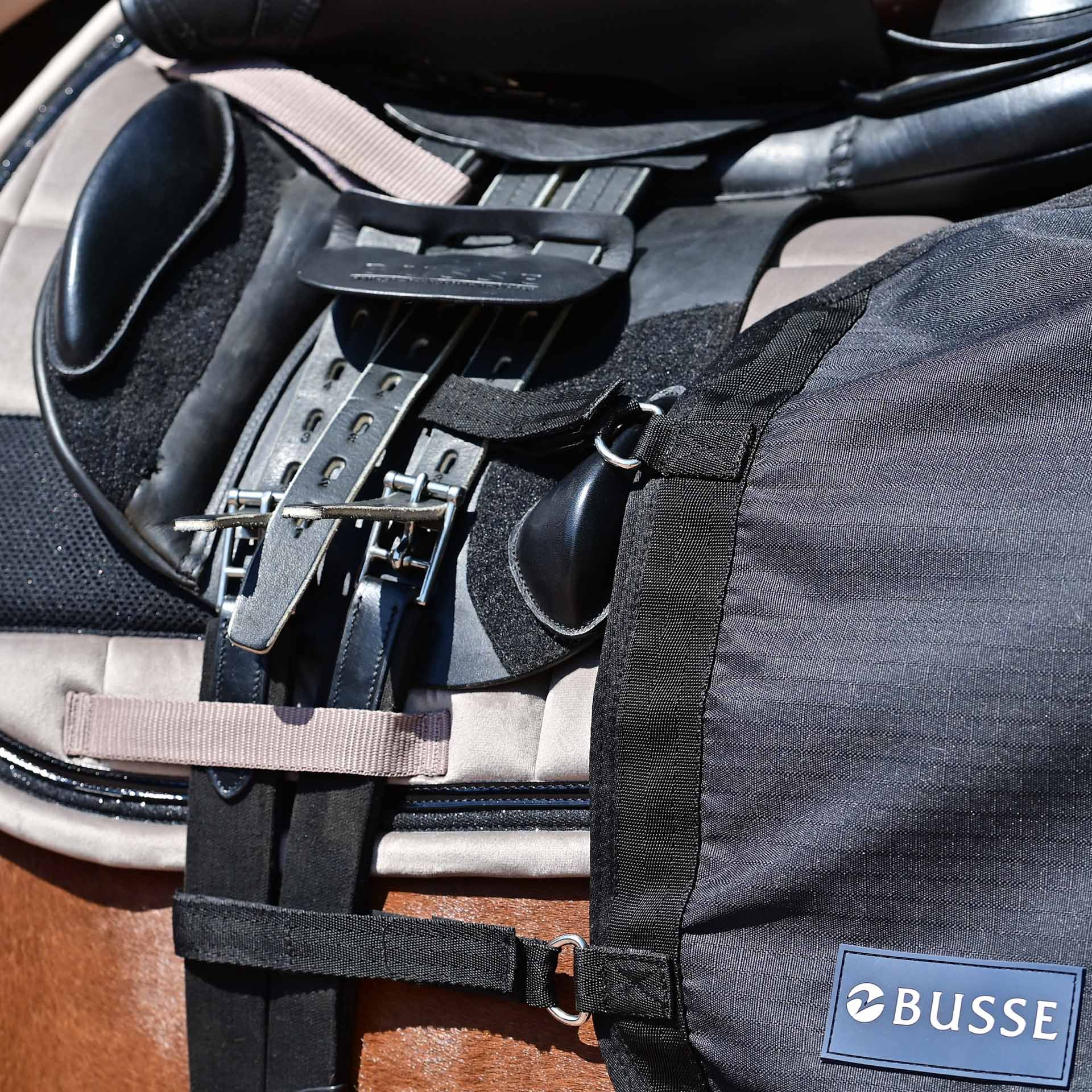 Die BUSSE Trainingsdecke RAIN 50 ist schnell und einfach mit vier variablen Klettverschluss-Schlaufen an den Sattelgurtstrupfen bzw. dem Gurt und bei Monoblattsätteln ggf. an den Steigbügelriemenlaschen zu befestigen. Eine bewusst reduzierte Seitentiefe ermöglicht ungestörte Schenkelhilfen bzw. einen sensiblen Gerteneinsatz. Eine Hinterhandkordel und ein farblich abgestimmtes Einfassband runden die Ausstattung ab.
