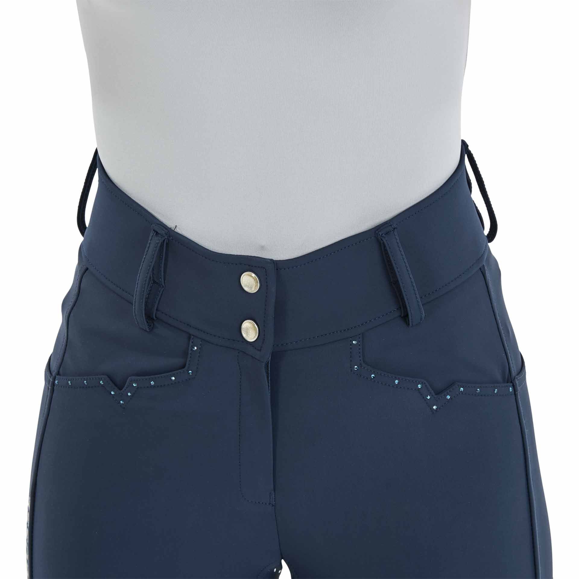 Das Design der Reithose ist elegant mit kleinen Highlight-Details. Sie verfügt über zwei Einschubtaschen seitlich an den Oberschenkeln, speziell im Smartphoneformat, und visuell angedeutete Fronttaschen mit einem Zackeneinschnitt als Eye-Catcher, besetzt mit kleinen Strasssteinen. Ein glitzernder Silikon-Print seitlich des rechten Oberschenkels auf der Smartphonetasche und ein breiter Hosenbund mit zwei schimmernden Glitzerknöpfen verleihen der Reithose einen Hauch von Glamour.