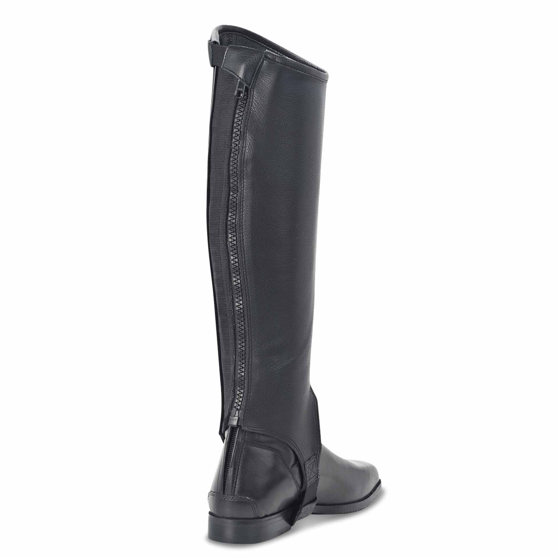 Die Wadenchaps sind im Außenbereich aus strapazierfähigem Kunstleder in Lederoptik gefertigt und bieten eine hohe Dehnkapazität für eine perfekte Passform. Der gesamte Innenbereich besteht aus vollnarbigem Leder, was für optimalen Kontakt zum Pferdeleib und natürliche Haftung am Sattelblatt sorgt. Als Verschluss dient ein strapazierfähiger YKK®-Vislon-Reißverschluss, der von unten nach oben geöffnet wird und einseitig elastisch eingearbeitet ist.