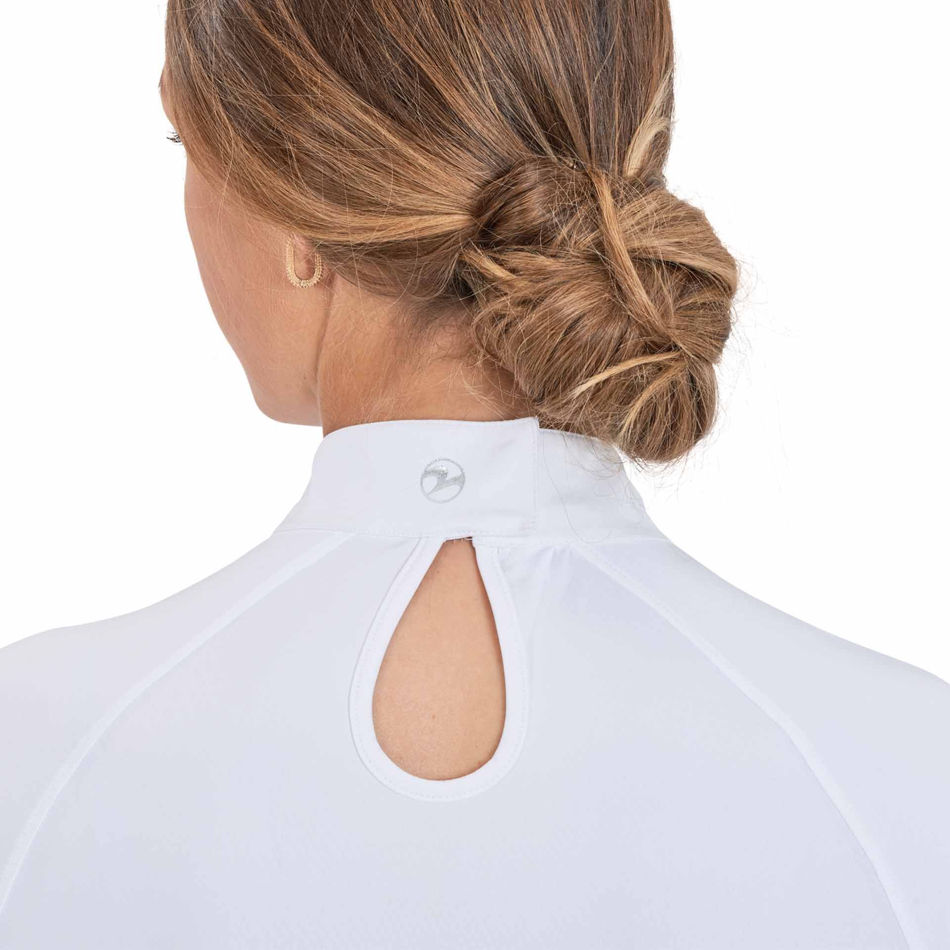Das Shirt besitzt einen Stehkragen, der hinten mit einem kleinen Tröpfchenausschnitt versehen und durch Druckknöpfe zu schließen ist. Ein Silikon-Logo-Print auf der Rückseite des Kragens unterstreicht den sportlichen Look. Dank der figurschmeichelnden Nahtführung und Raglanärmeln, die die Schultern schmaler wirken lassen, betont das Shirt die feminine Linie der Trägerin.