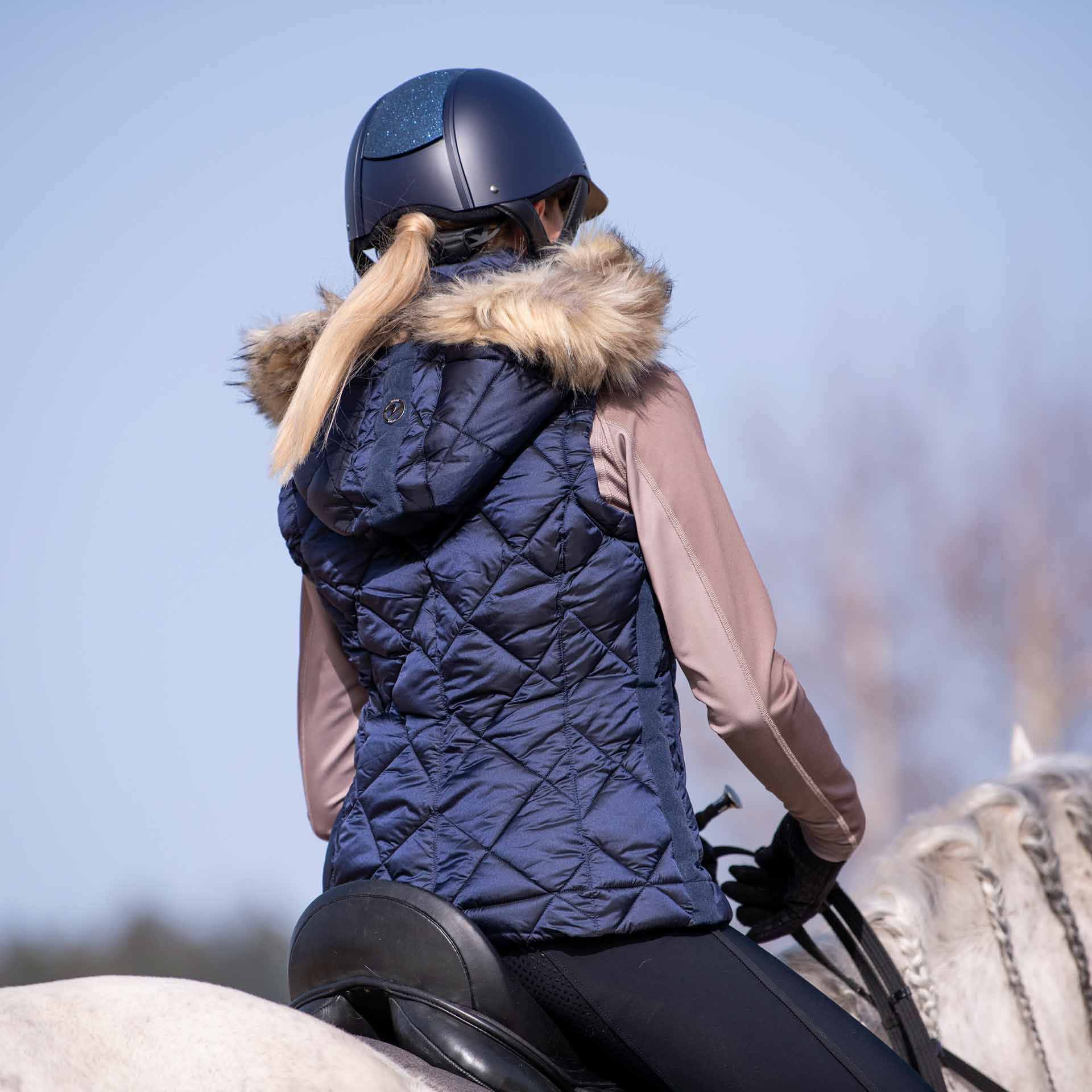 Die BUSSE Weste BRIANA verfügt über einen speziellen Knopf, um die Weste auch geöffnet in Position zu halten und zwei praktische Reißverschluss-Taschen sowie eine Innentasche mit Kabeldurchführungsöffnung für Headsets. Der Innenkragen mit weichem Kunstfell und die regulierbare und abnehmbare Kapuze mit ebenfalls abnehmbarem Kunstfellkragen, die zum Reiten im Rückenbereich fixiert werden kann, bieten zusätzlichen Komfort und Funktionalität.