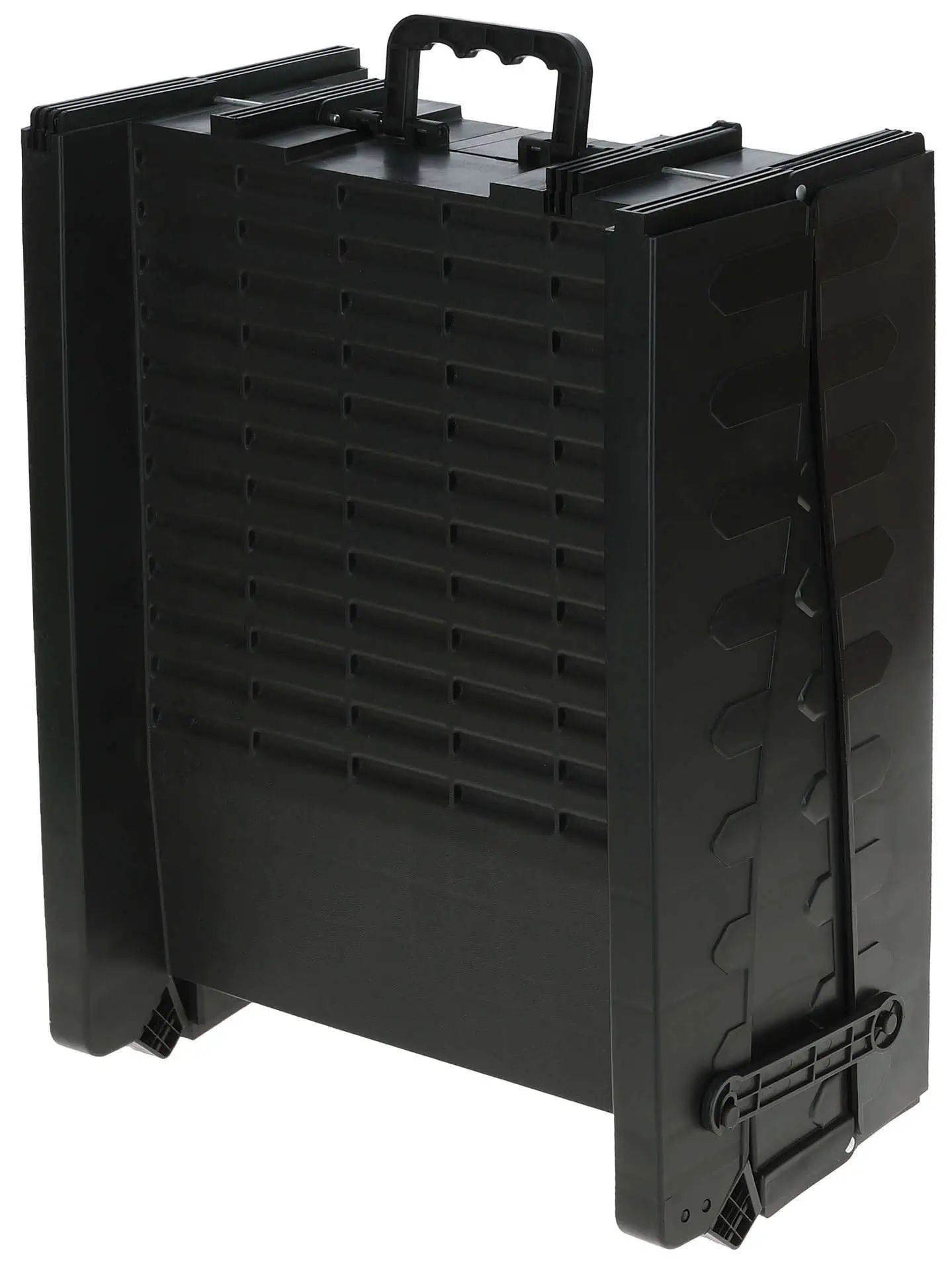 Die Rampe ist 3-fach zusammenfaltbar, was den Transport und die Lagerung erleichtert. Ihre Maße im zusammengeklappten Zustand sind 52 x 41 x 26 cm, was sie kompakt und einfach zu handhaben macht. Sie kommt mit einem Tragegriff für noch bequemeres Tragen und Positionieren.
