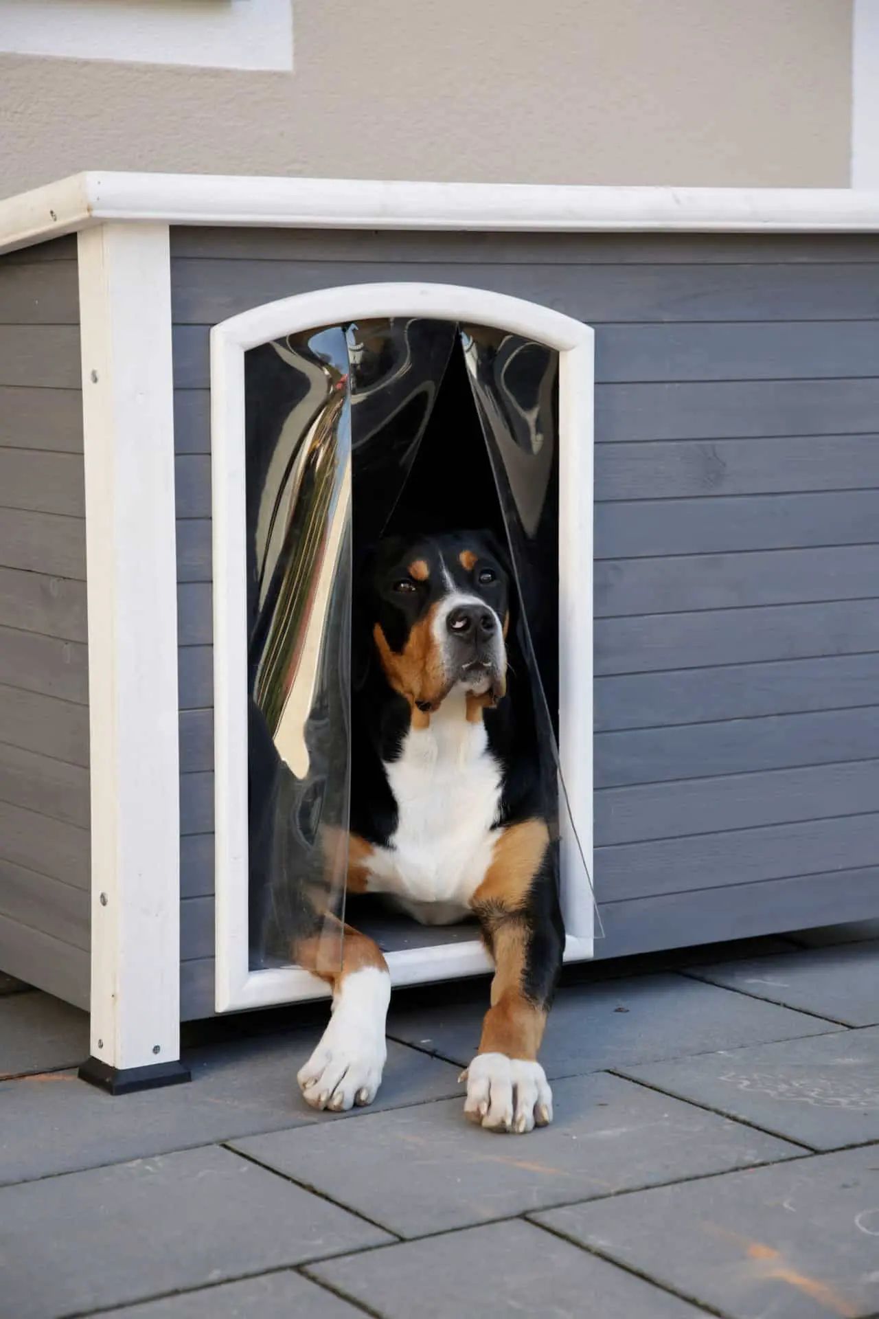 Ein Vorhang aus transparenten Lamellen bietet zusätzlichen Schutz vor Wind und Wetter, ohne die Sicht Ihres Hundes zu behindern. Die Hundehütte wird zerlegt geliefert, kann aber dank der beiliegenden Aufbauanleitung einfach montiert werden.