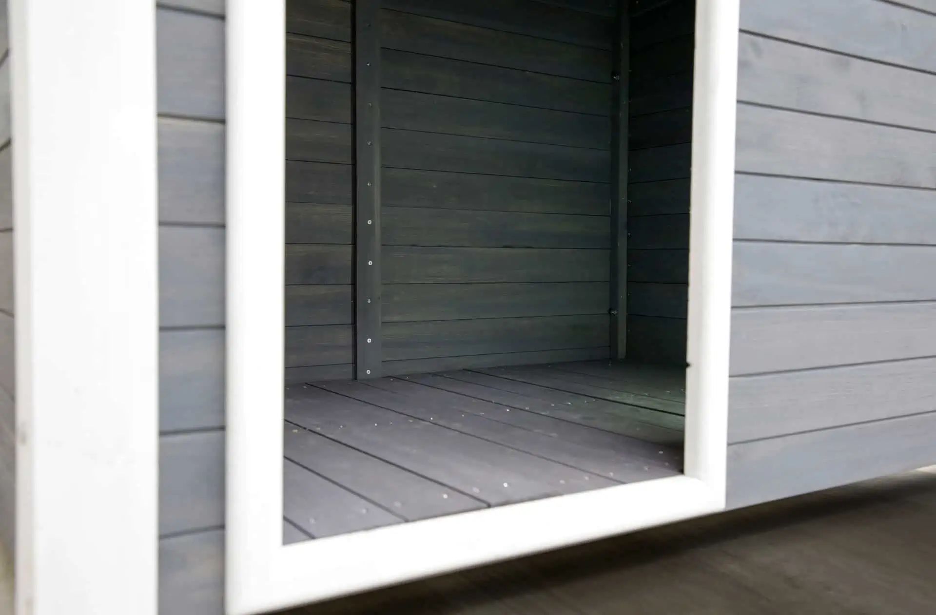 Die Hundehütte ist außen mit Holzschutzfarbe lasiert, was ihr einen attraktiven Look verleiht und gleichzeitig das Holz vor Witterungseinflüssen schützt. Zudem ist die Hütte mit Kunststofffüßen ausgestattet, die für Stabilität und eine gute Luftzirkulation unter der Hütte sorgen.