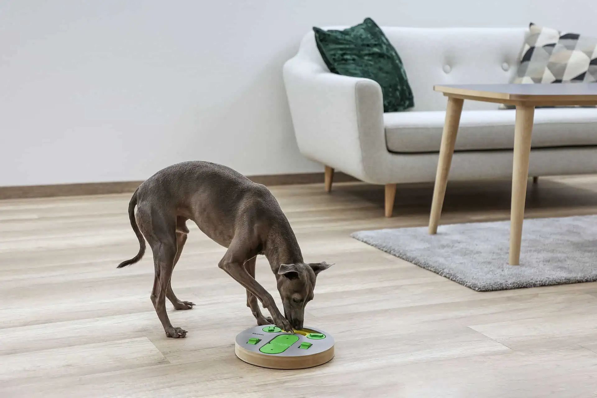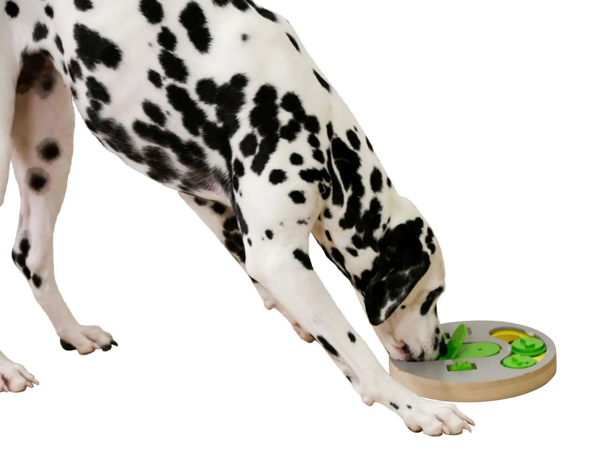 Das robuste Design aus MDF-Holz mit lackierter Oberfläche sorgt für Langlebigkeit. Die rutschfeste Unterseite garantiert sicheren Halt während des Spiels. Dein Hund wird begeistert sein, die Leckerlies durch die cleveren Schnüffellöcher zu finden.