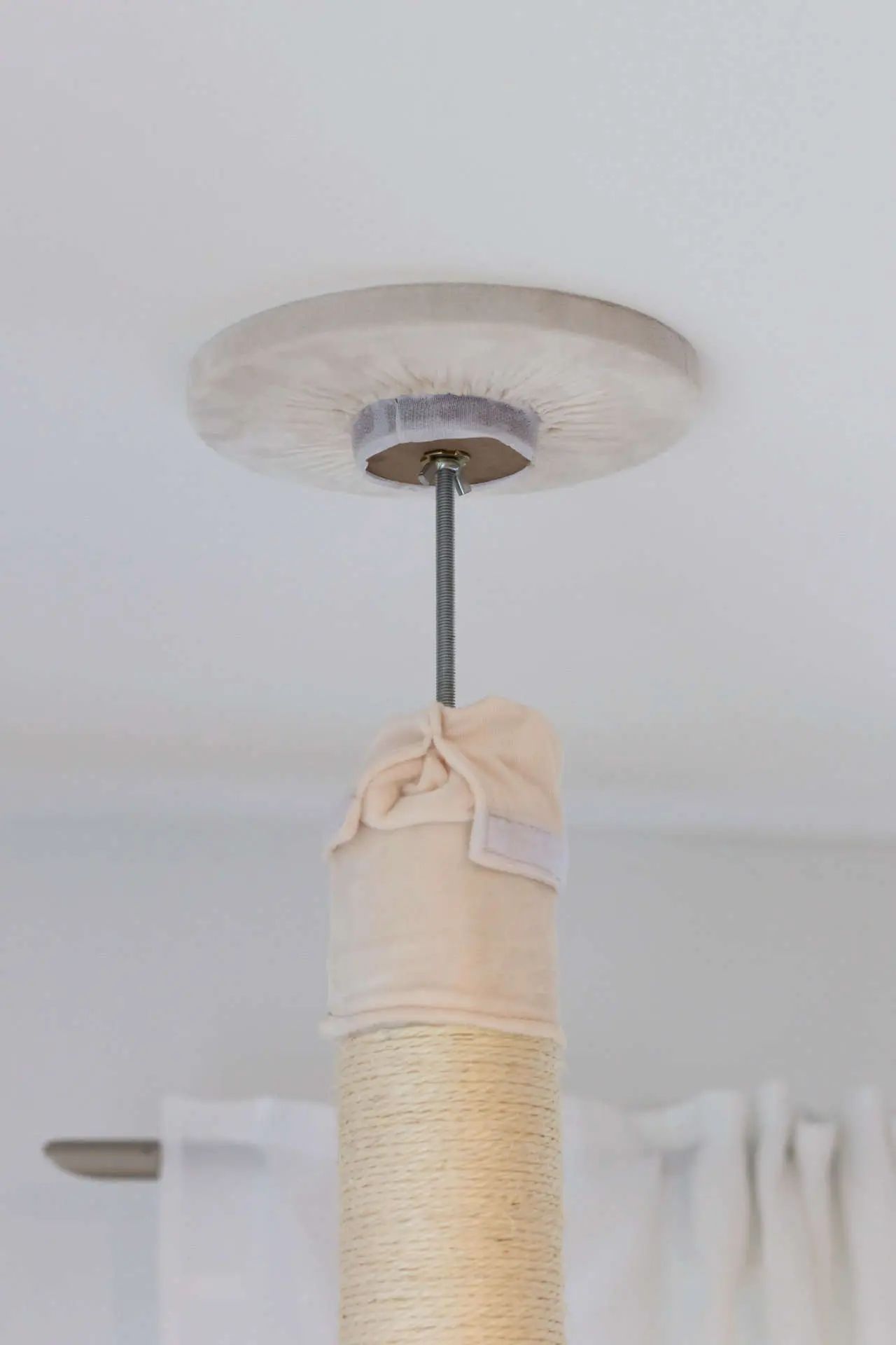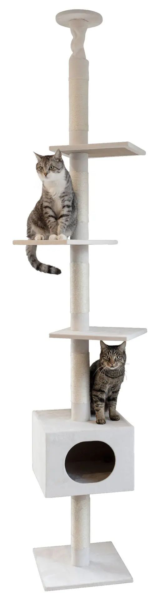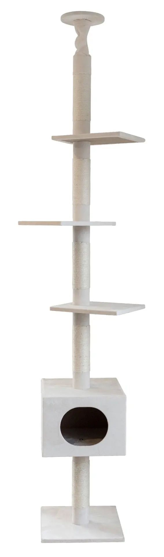 Der Kratzbaum Ferdi weiß bietet eine Vielzahl an Spielmöglichkeiten mit Sisal verklebten Säulen, mehreren Liegeflächen und einer Höhle. Mit dem Deckenspanner kann er sicher an der Decke befestigt werden.