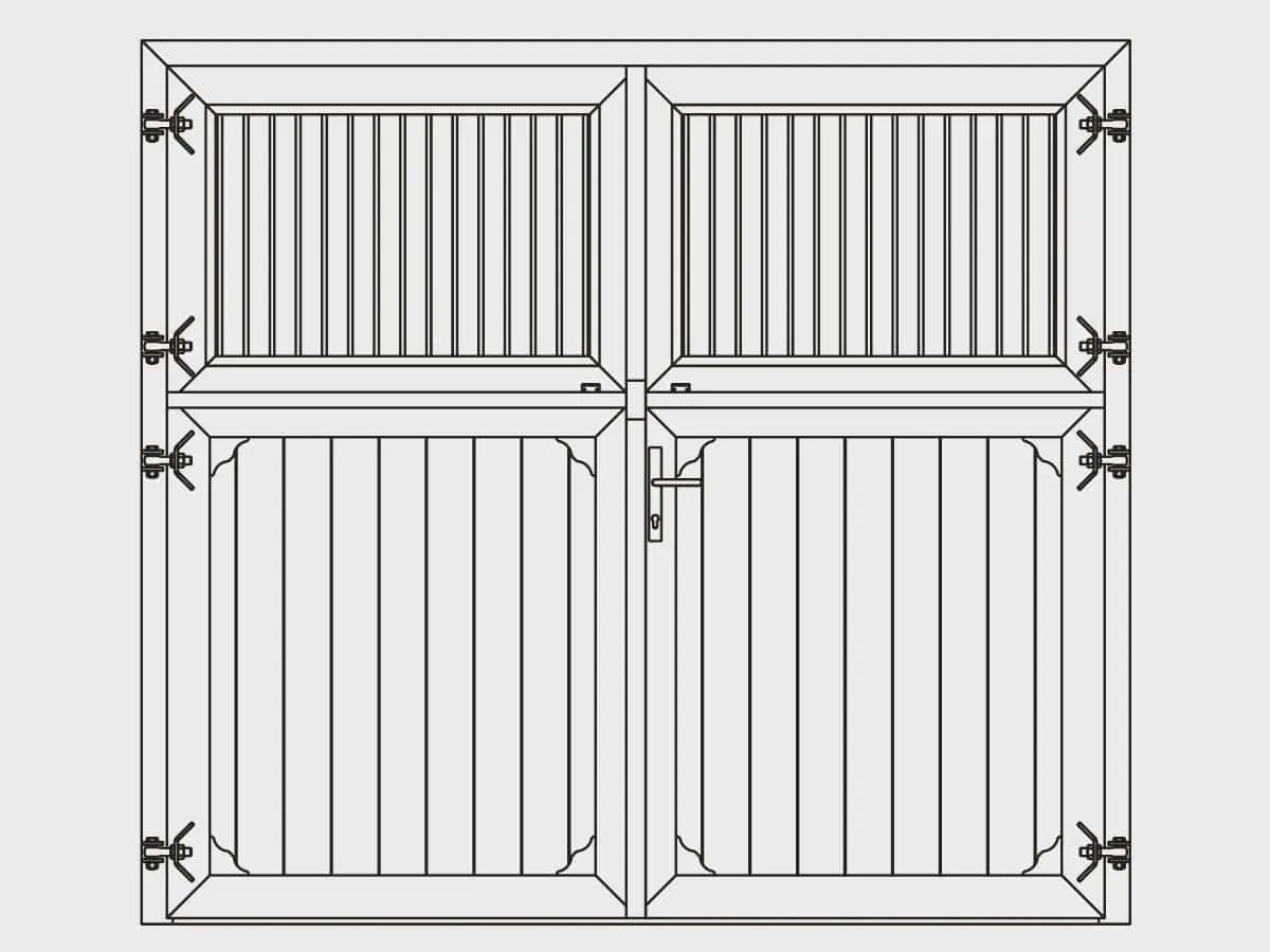 Das Growi Stalltor mit Drehfenster ist waagerecht geteilt und besteht aus vier Teil-Bereichen. Die Holzfüllung besteht aus einer wetterfesten Trägerplatte mit 12,5 mm Deckschicht aus nordischem Nadelholz. Die Bretter sind vorgrundiert bzw. hellgrün imprägniert - von innen sieht man die dunkelbraune Trägerplatte. Mit beidseitiger Drückergarnitur. Growi Stalltore verfügen über eine Zarge aus 80/80/8-Winkelstahl mit Laschen zum Dübeln sowie einen Profilrohr-Rahmen mit verstellbaren Augenschrauben und 4 mm-Sicherheitsverglasung mit Gummi-Kederprofil.