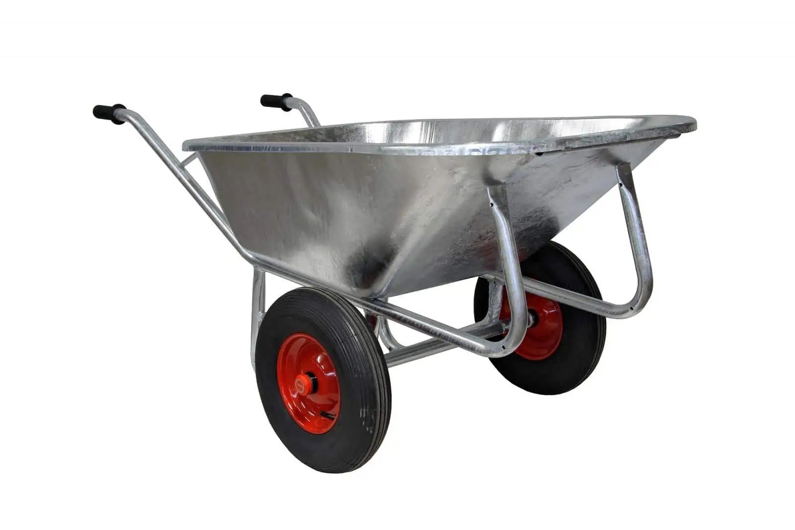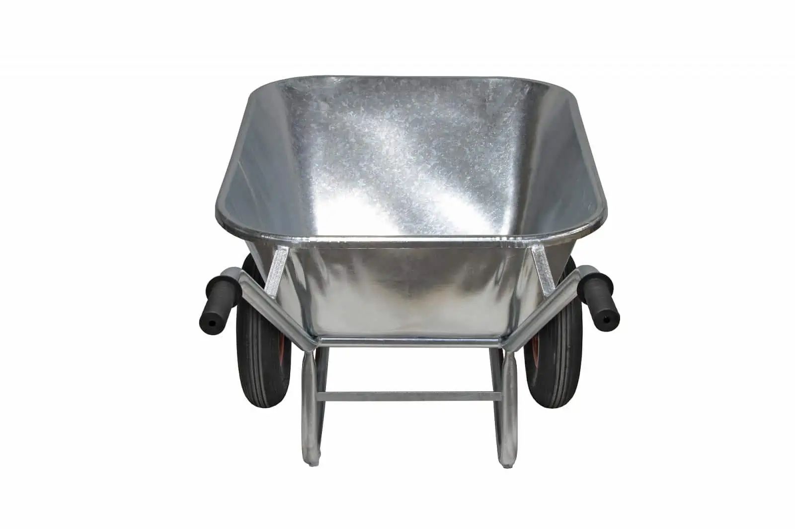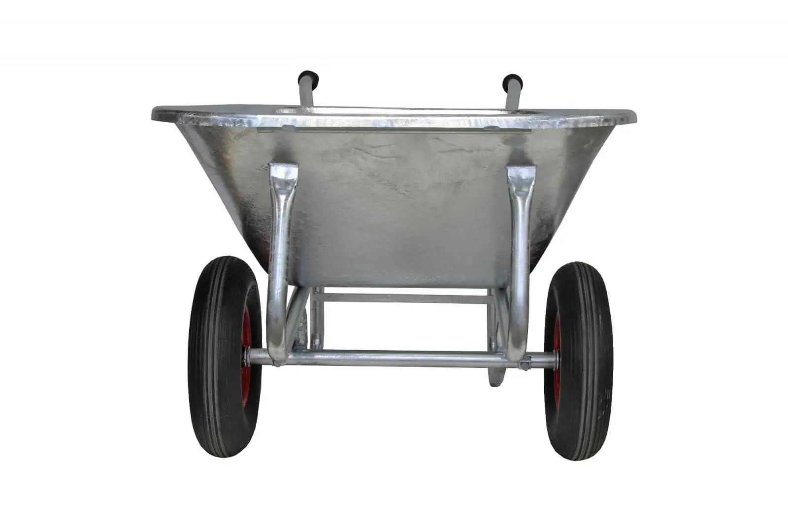 Besondere Eigenschaften dieser Grossmuldenkarre sind die 2-Rad-Achse und die luftbereiften Räder (400/100 mm), die eine hervorragende Stabilität und Manövrierfähigkeit bieten. Die komplette Konstruktion ist im Vollbad feuerverzinkt, was eine hohe Korrosionsbeständigkeit und Langlebigkeit gewährleistet. Die Mulde und das Untergestell sind zusammengeschweißt, wodurch eine besonders hohe Stabilität und Belastbarkeit erreicht wird.