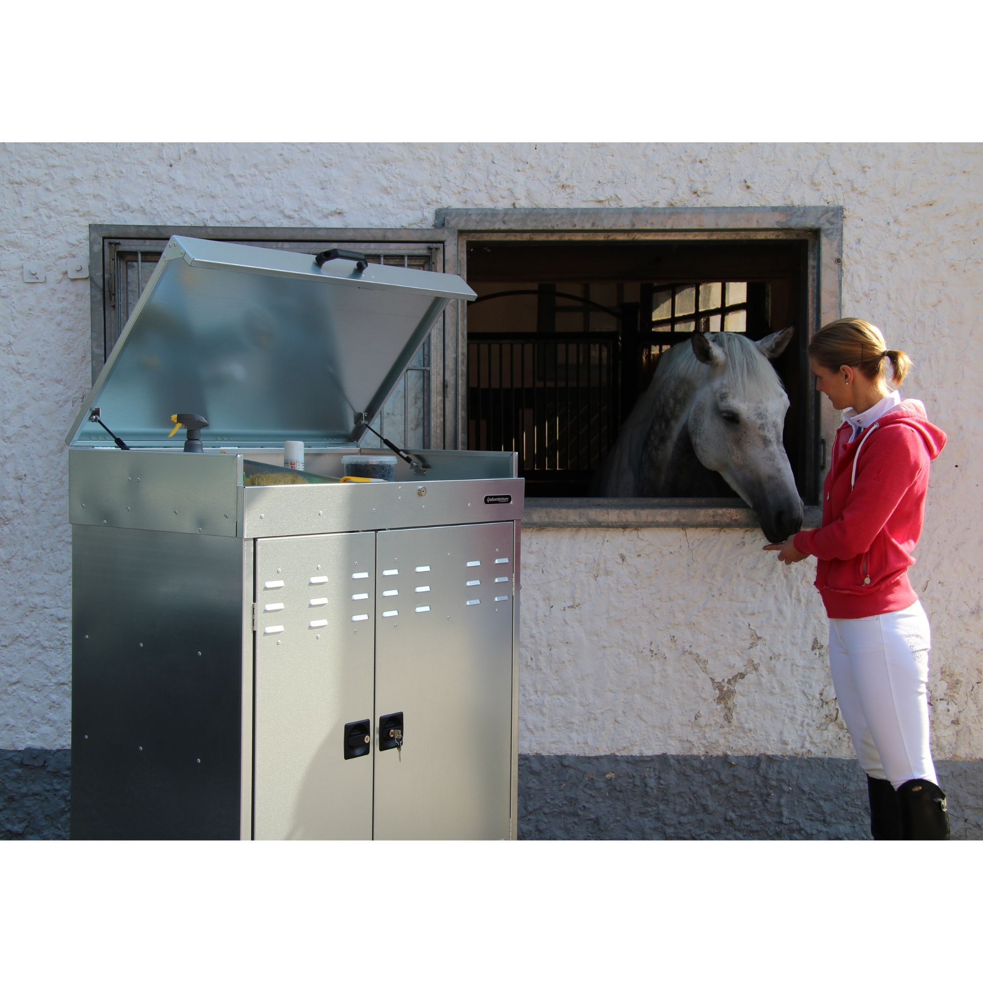 Dieser verzinkte Turnierschrank besteht aus einem stabilen Metallgehäuse und wird komplett montiert geliefert.