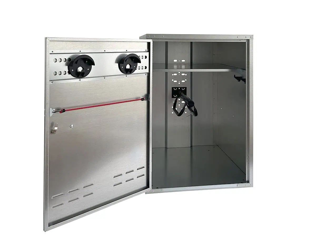 Die stablen Kunststoff-Handgriffe und die Option, den Schrank mit einem Zylinderschloss oder einem Vorhangschloss zu sichern, gewährleisten höchsten Komfort und Sicherheit. Die Growi Sattelschränke sind besonders robust, da alle Kanten doppelt umgelegt und genietet sind, was Korrosion vorbeugt und scharfe Kanten vermeidet. Die Ablageböden können nach Belieben herausgezogen und eingerastet werden, was eine flexible Nutzung ermöglicht. Der Schrank ist daher ideal für die Aufbewahrung von Sattel, Trensen und Bürsten auf kleinstem Raum und schützt Ihre Ausrüstung zuverlässig.