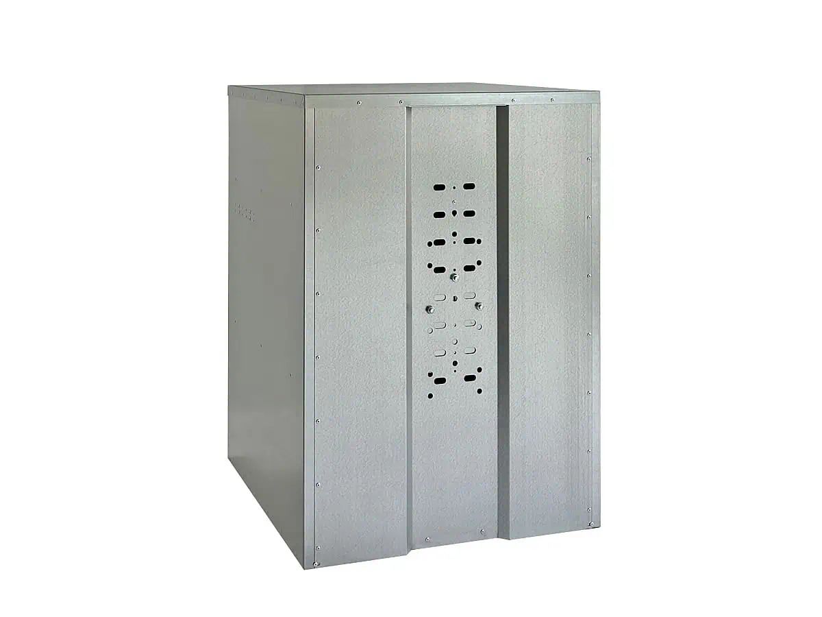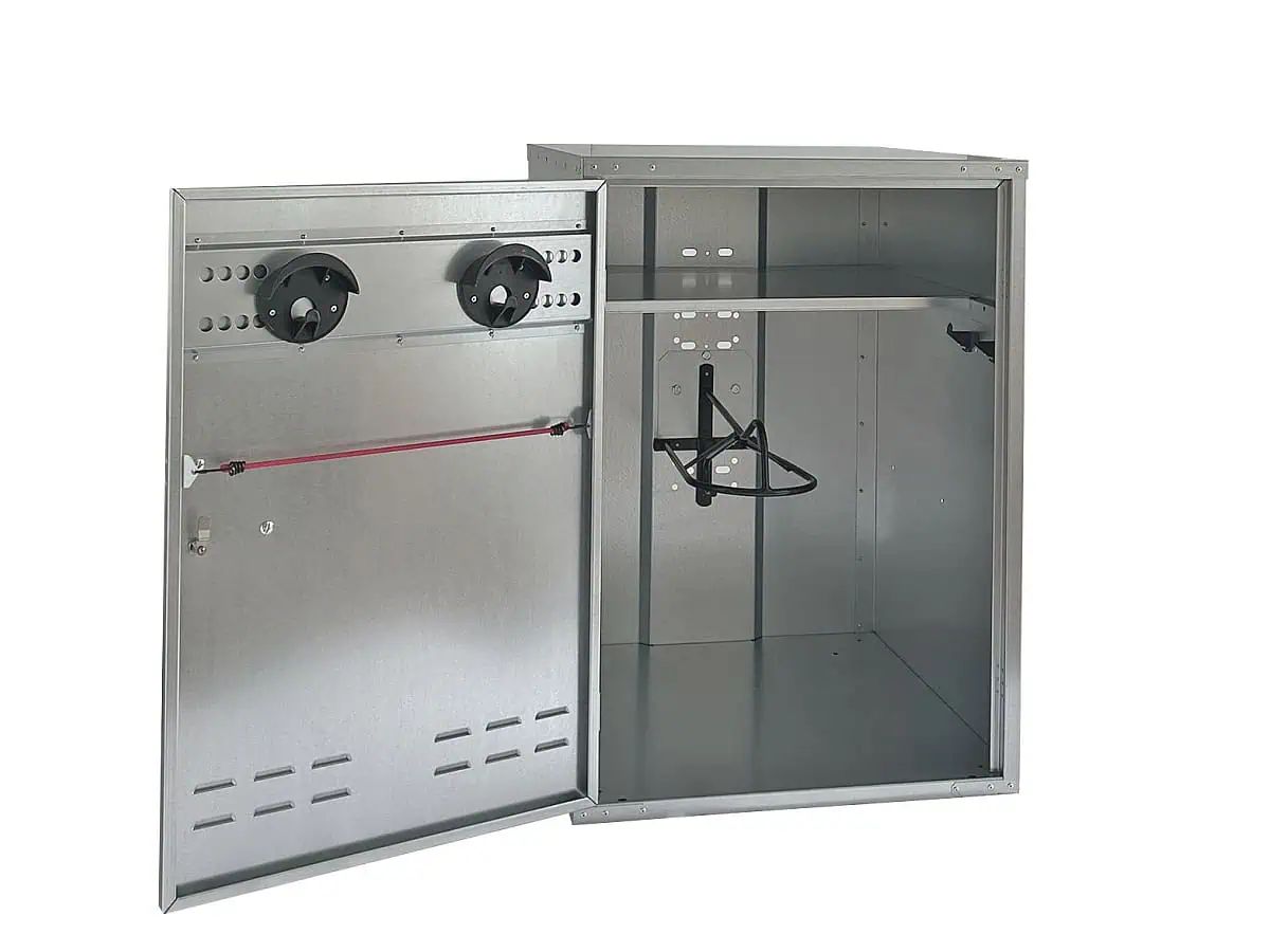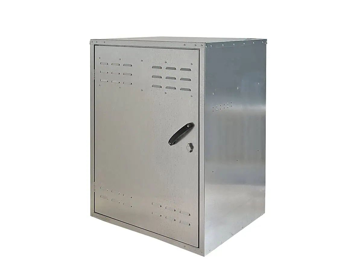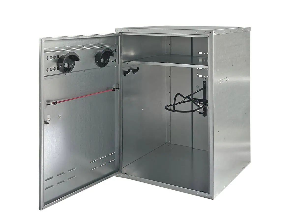 Dieser Sattelschrank zeichnet sich durch seine robuste Bauweise und durchdachte Details aus. Alle Kanten sind doppelt umgelegt, was eine besonders hohe Stabilität und Sicherheit ohne scharfe Kanten gewährleistet. Die Einlegeböden lassen sich nach Belieben nach vorne oder hinten herausziehen und einrasten, um eine individuelle Anpassung zu ermöglichen. Zudem schützt das genietete Design vor Korrosion, da Schweißpunkte, die auf Dauer rosten könnten, entfallen.