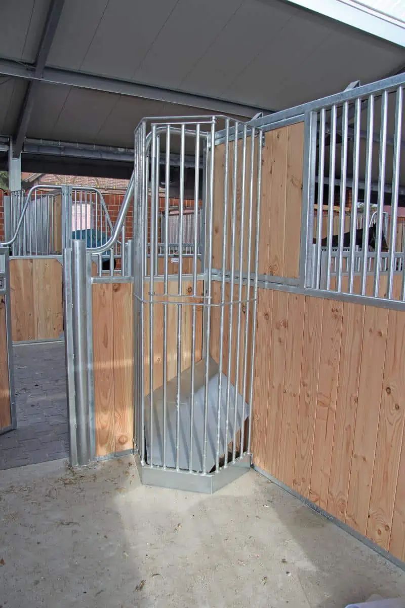 Diese feuerverzinkte Heuraufe kann als Wand- oder Eckraufe verwendet werden. Im Bodenbereich befindet sich eine schräggestellte Bodenplatte, so dass Heureste gut nachrutschen können. Die Heuraufe lässt sich sehr leicht von vorn befüllen.