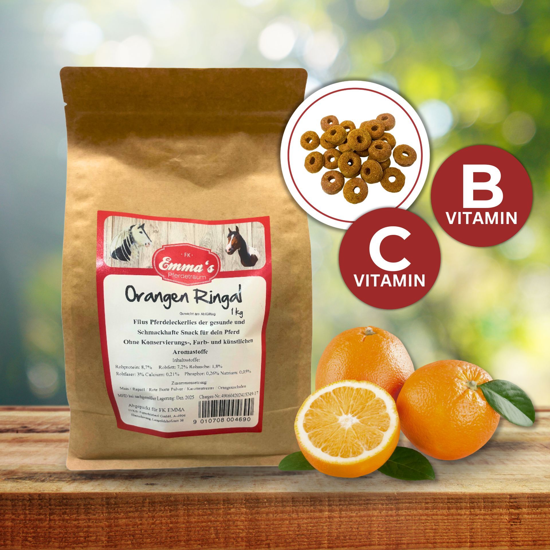 Entdecke jetzt Emmas Pferdeleckerli Orangen Ringal – 100 % Natur, ohne künstliche Farb- und Konservierungsstoffe und vollkommen chemiefrei! Diese schmackhaften Leckereien werden in einer kleinen Mühle in Deutschland hergestellt und überzeugen durch ihre extrem hohe Akzeptanz bei Pferden. Mit ihrer natürlichen und intensiven Geschmackskomposition sind sie der perfekte Snack für dein Pferd.