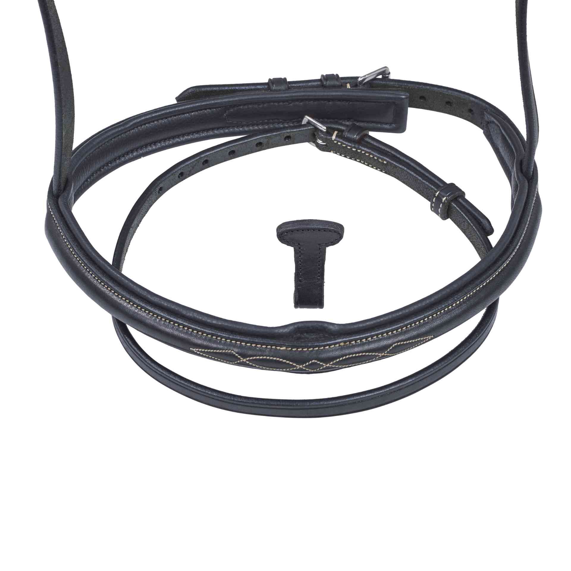 - Zügel: Griffige Gurtzügel mit Martingalschiebern, Lederstegen, Lederenden, Edelstahlschnallen und abgestimmten Ziernähten