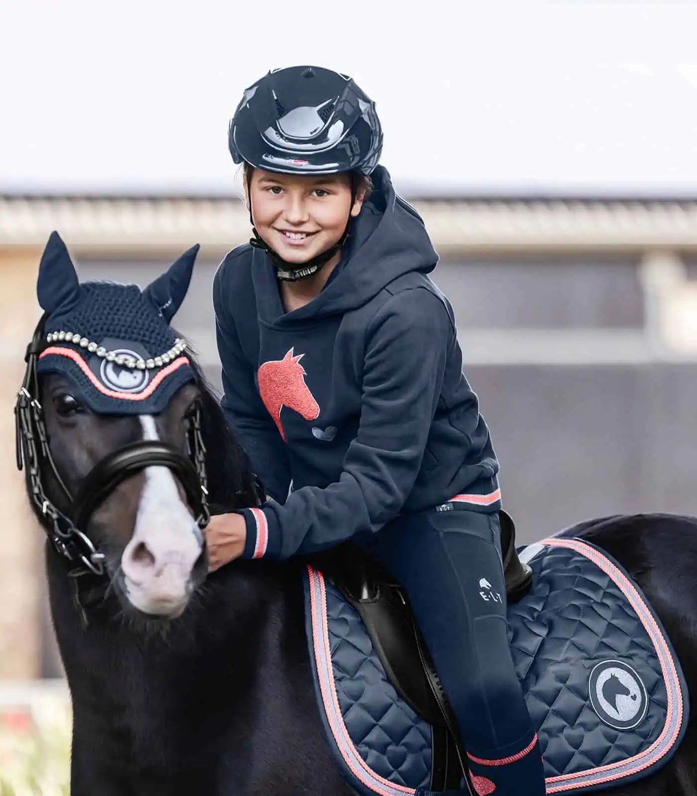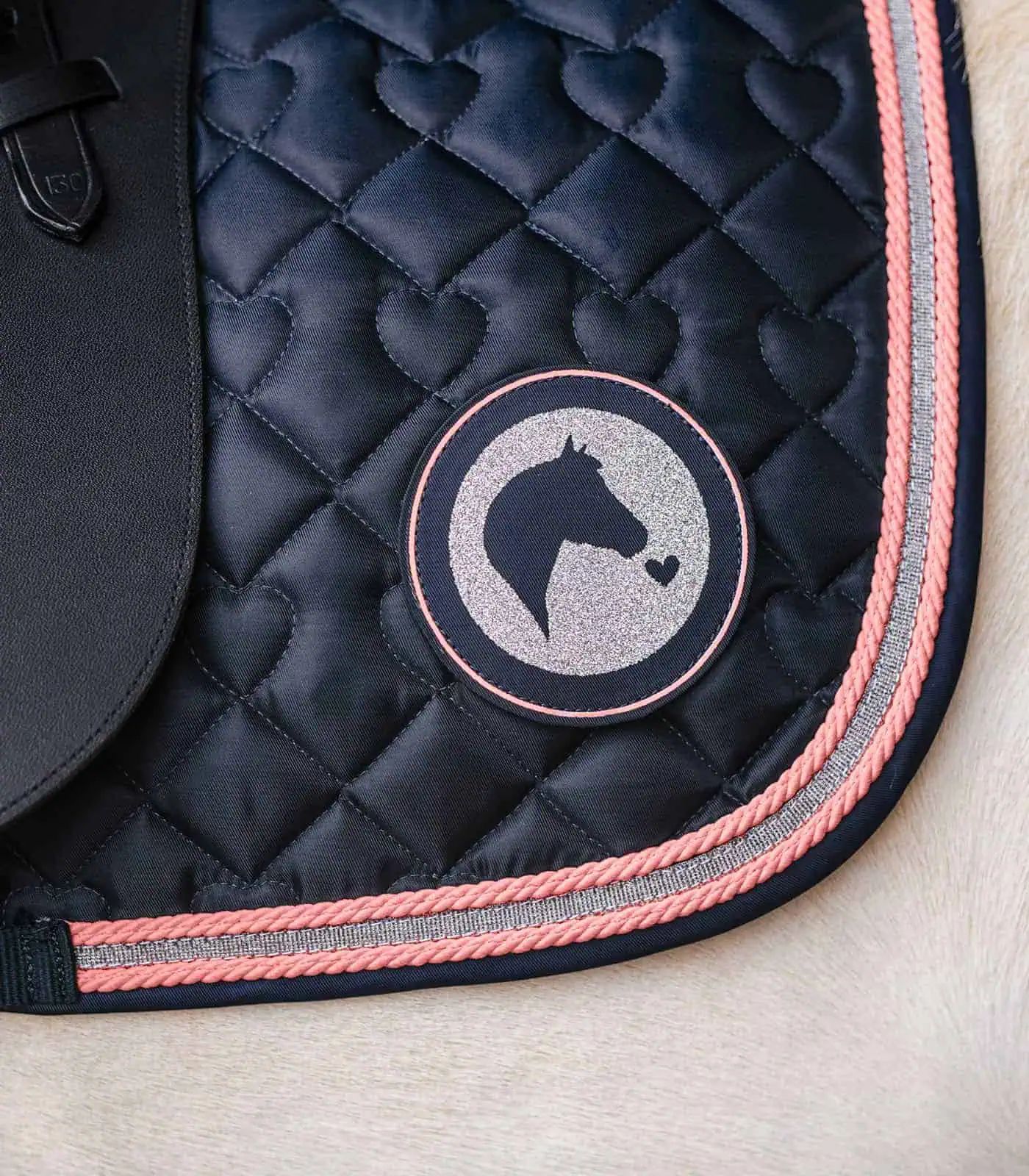 Das Herzchen-Steppdesign mit silberner Glitzerkordel ist einfach zauberhaft und verleiht der Schabracke eine besondere Eleganz. Das süße, glitzernde Kindermotiv rundet das Design perfekt ab, und macht sie zu einem echten Hingucker im Stall.