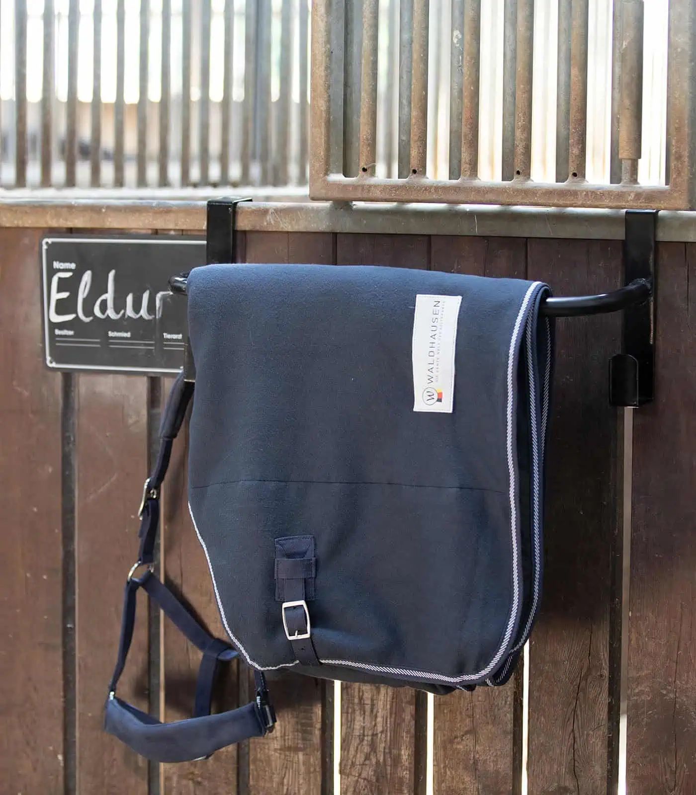 Der verstellbare Halter passt sich perfekt an deine Boxentür an und bietet sicheren Halt für deine Decke. Die zusätzlichen Halfter-/Trensenhalter sorgen für zusätzliche Ordnung vor der Boxentür und halten alles übersichtlich.