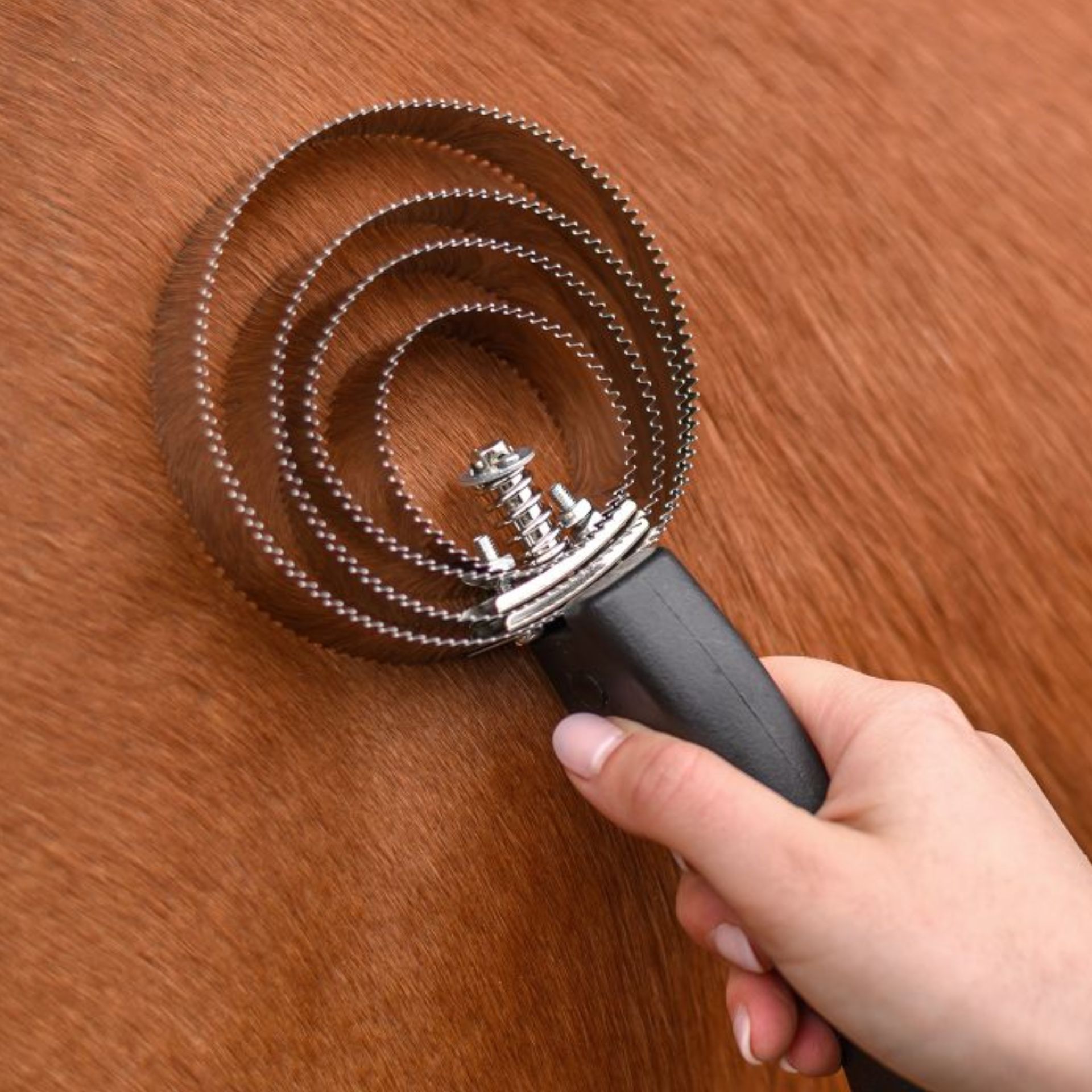 Der Striegel hat vier Edelstahlringe.
