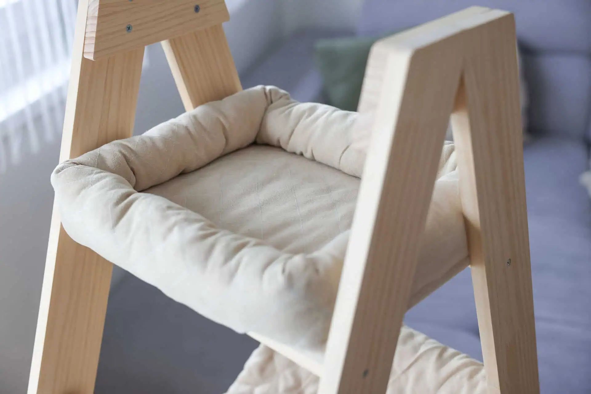 Der Kratzbaum Ladder ist aus Massivholz gefertigt und bietet durch die optionalen Wandbefestigungswinkel und vormontierten Filzgleiter maximale Stabilität.