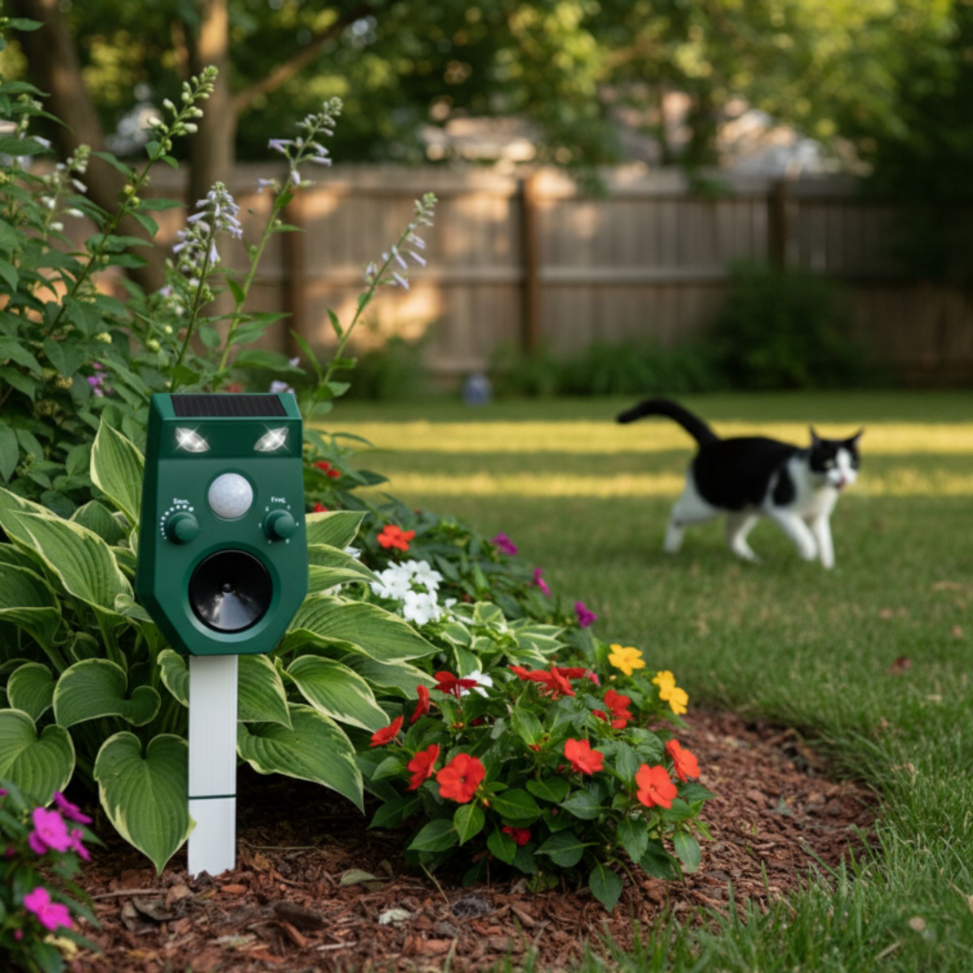 Der Ultraschall Tiervertreiber sendet Ultraschallwellen und blinkende Lichter aus, die aktiviert werden, sobald ein Tier den Bereich betritt. Diese Signale wirken abschreckend auf die Tiere, ohne ihnen zu schaden.