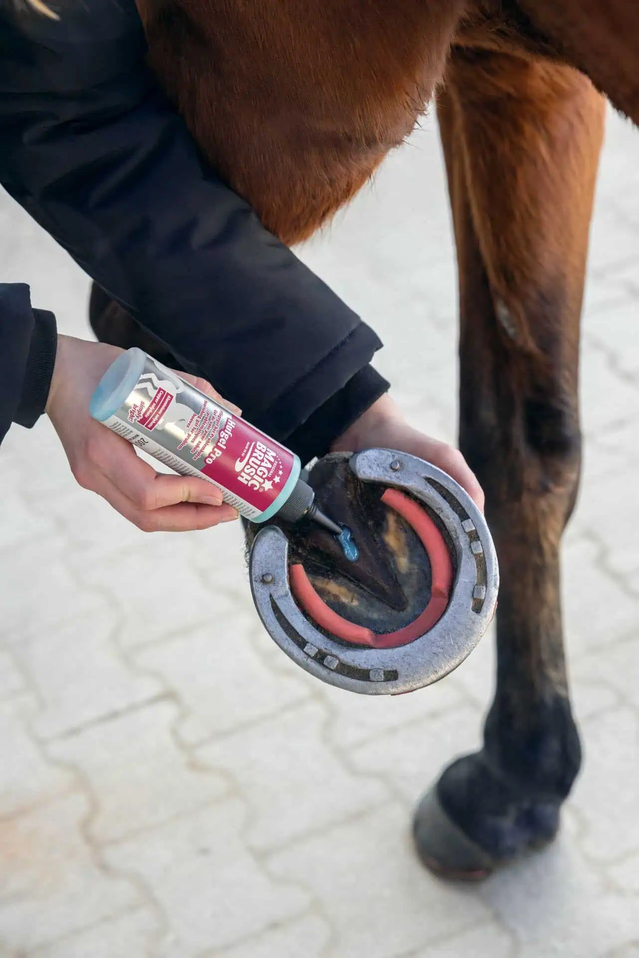 • leicht aufzutragen, haftet gut und trocknet schnell, ohne den Huf zu verkleben