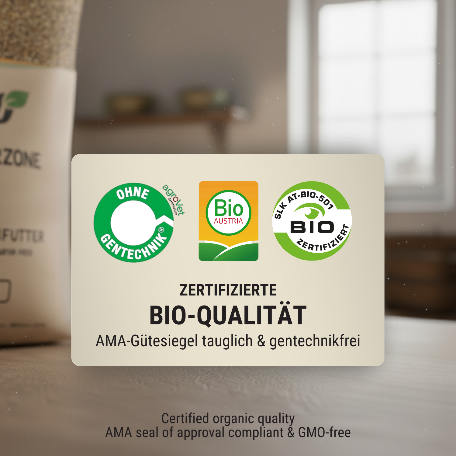 Unser gentechnikfreies Futter stammt ausschließlich aus biologischem Anbauund ist AMA-Gütesiegel tauglich. Das steht für höchste Qualität und Herkunftstransparenz.